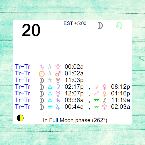 Note that the Moon moves at a rate of approximately one degree every 2 hours, so that if an aspect involving is applying and has an orb of 5 degrees, the aspect will perfect (be exact) in about 10 hours. If the Moon is separating from an aspect with an orb of 2 degrees, it has already formed said aspect approximately 4 hours ago (since the following are positions at noon today, then it would have occurred at about 8 AM today).