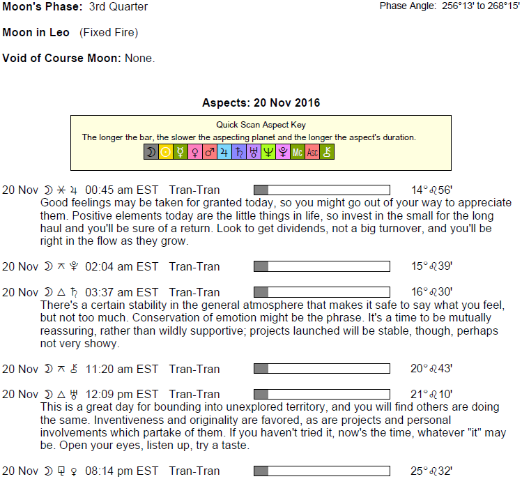 The following aspects (major only) and positions are at noon (EST) on November 20th: