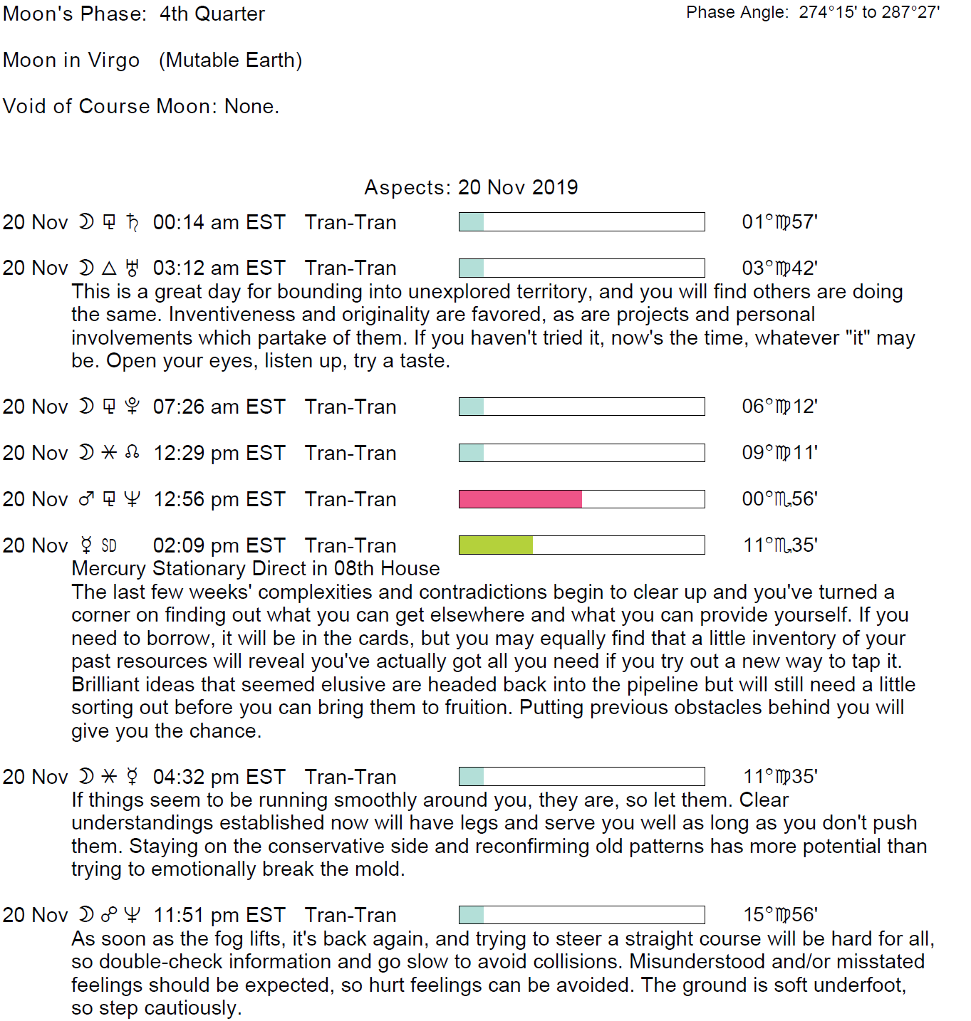 Planet Color Key: The longer the bar, the slower the aspecting planet and the longer the duration of the planet’s transit.