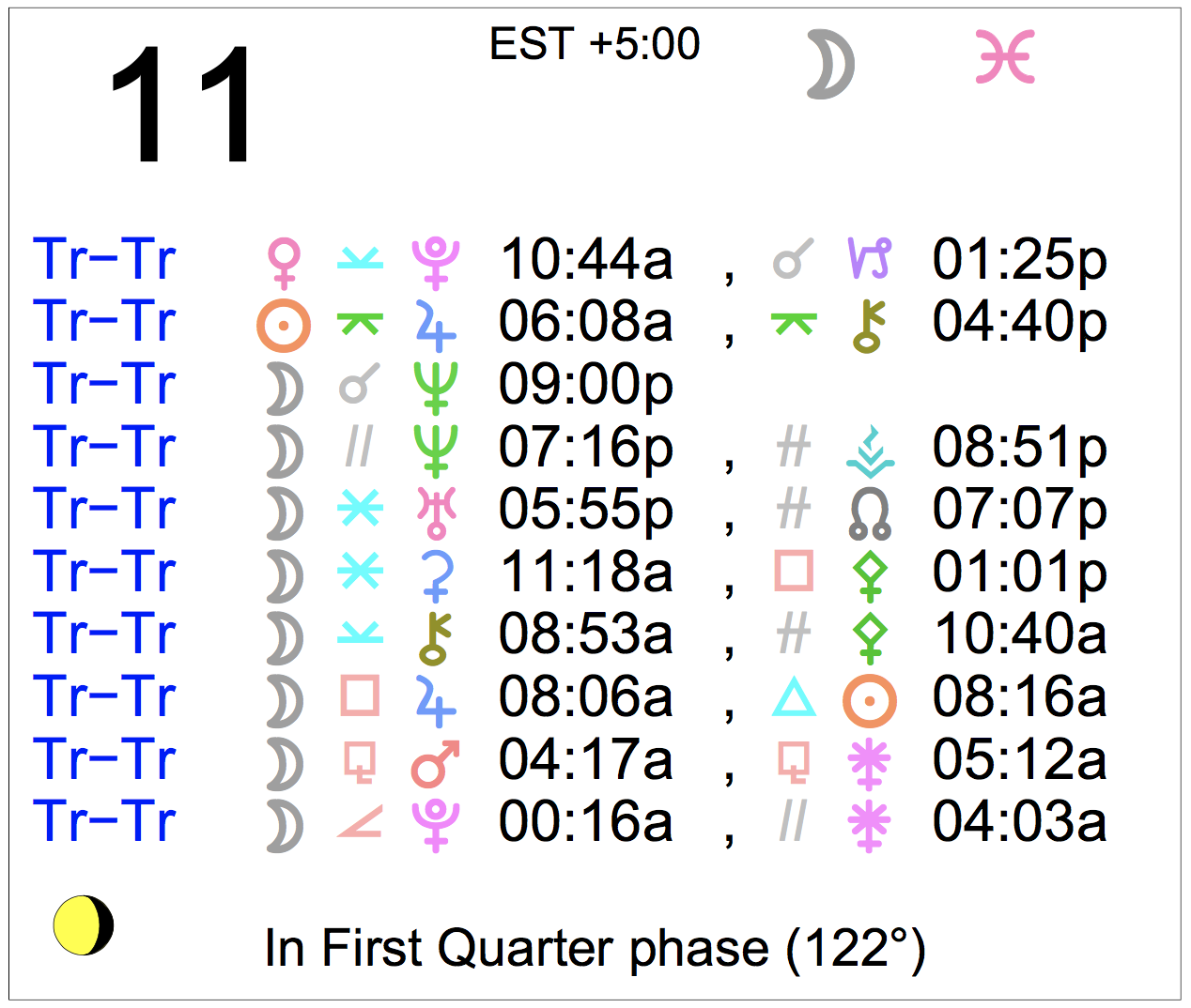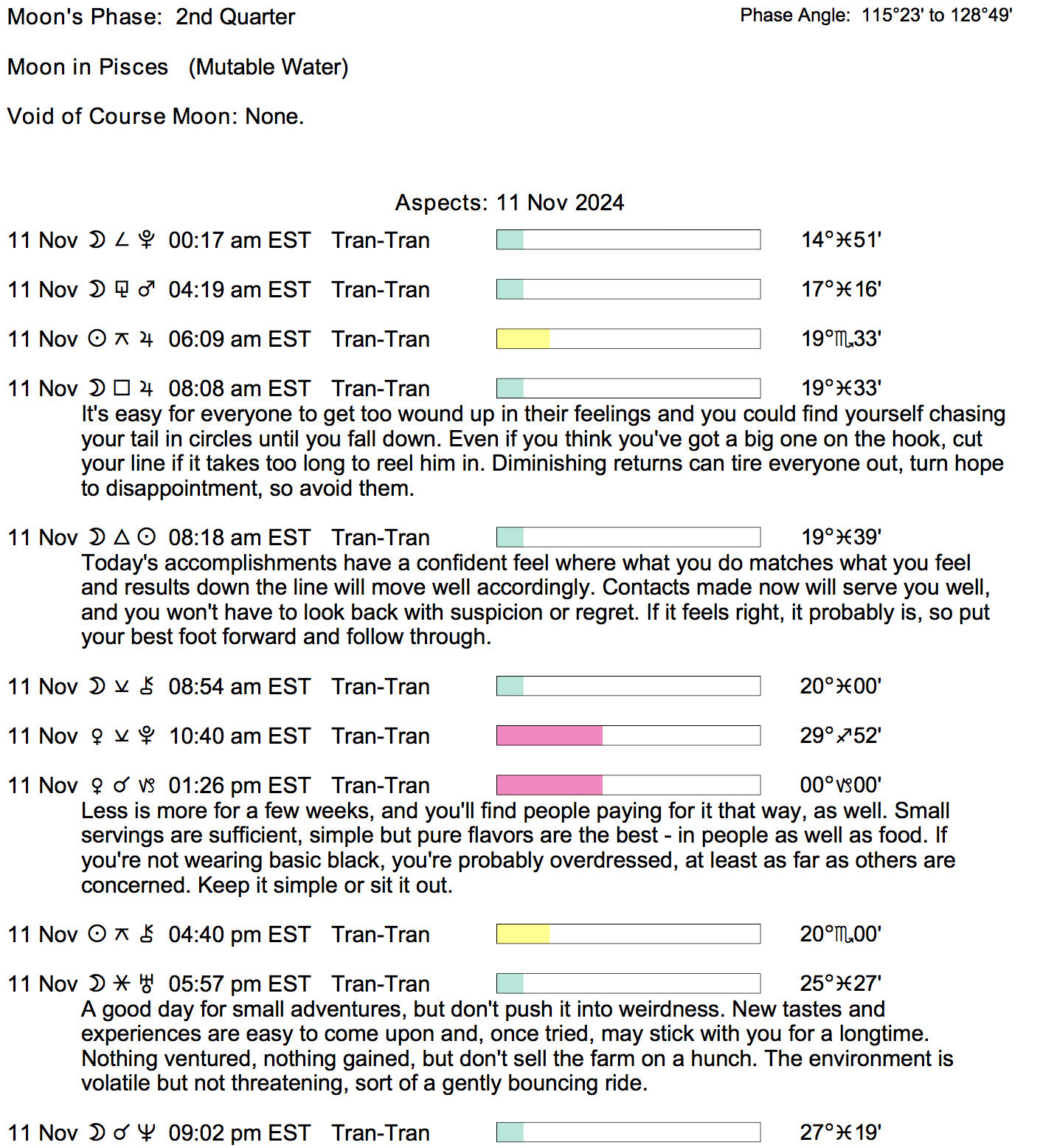 Planet Color Key: The longer the bar, the slower the aspecting planet, and the longer the duration of the planet’s transit.