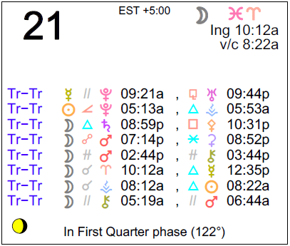 If you’re astrologically inclined and interested in the details of the Astrology of today, here are some of the factors considered in the forecasts (for the astrology of the week, see This Week in Astrology):
