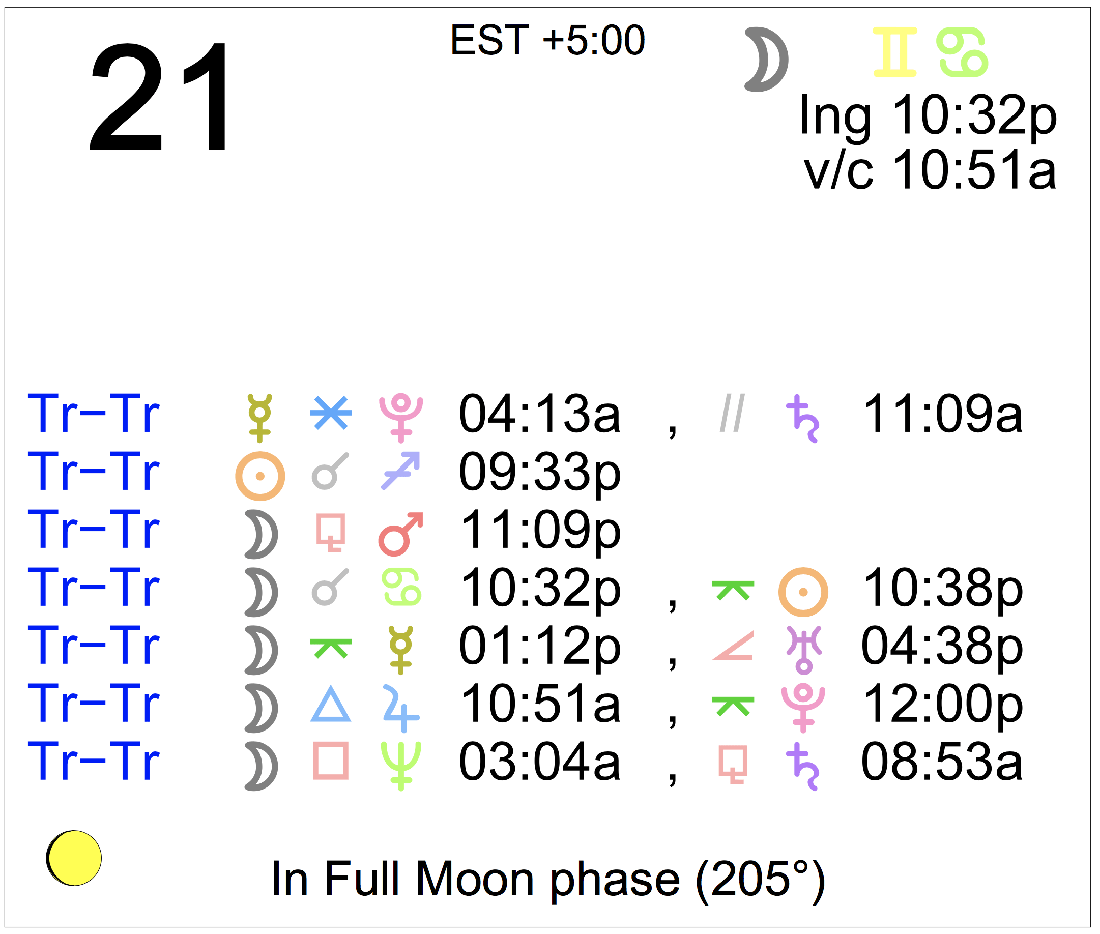 - The Moon is in Gemini until 10:32 PM, after which the Moon is in Cancer.