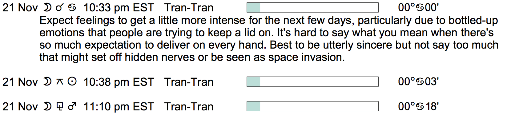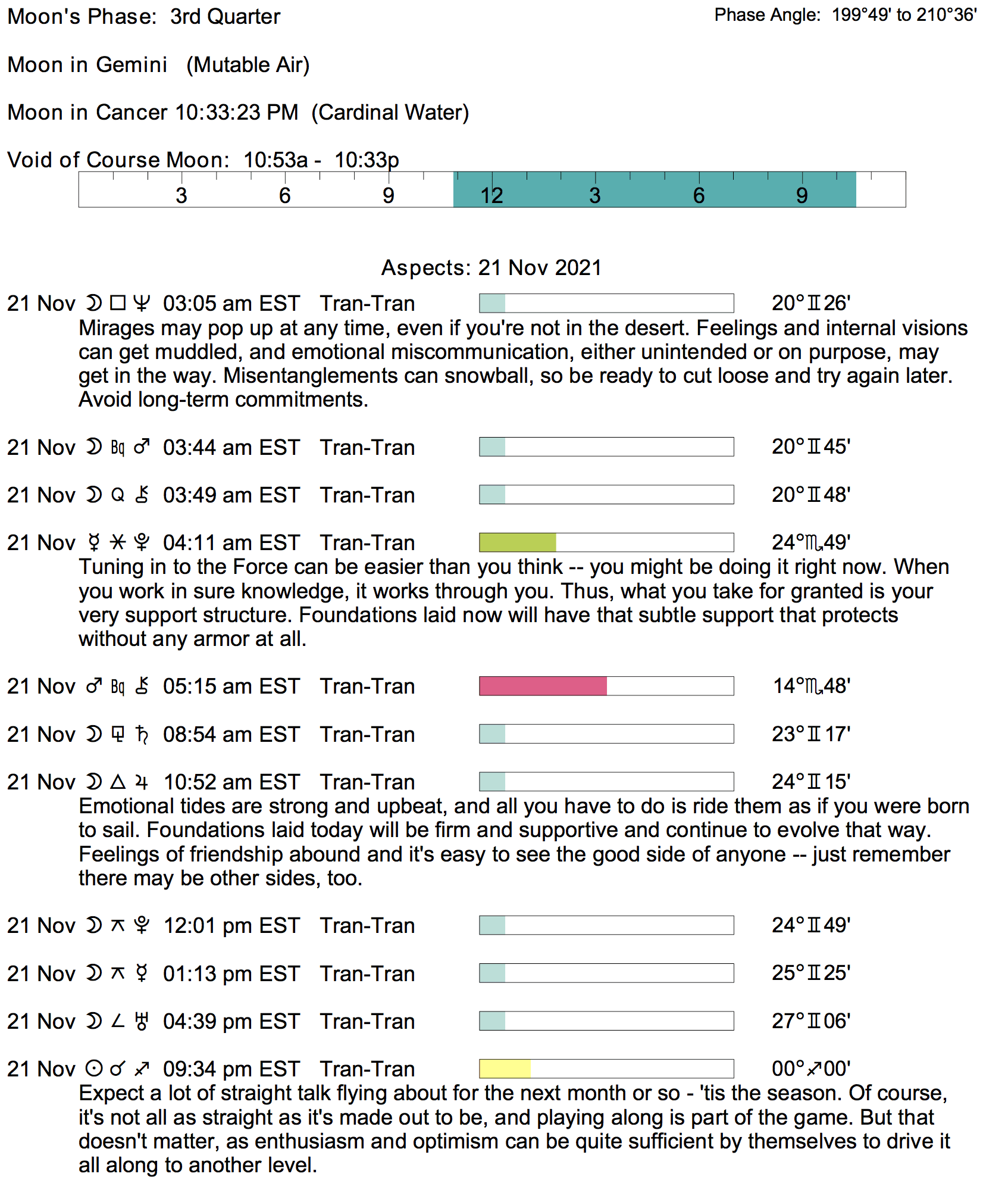 Planet Color Key: The longer the bar, the slower the aspecting planet, and the longer the duration of the planet’s transit.