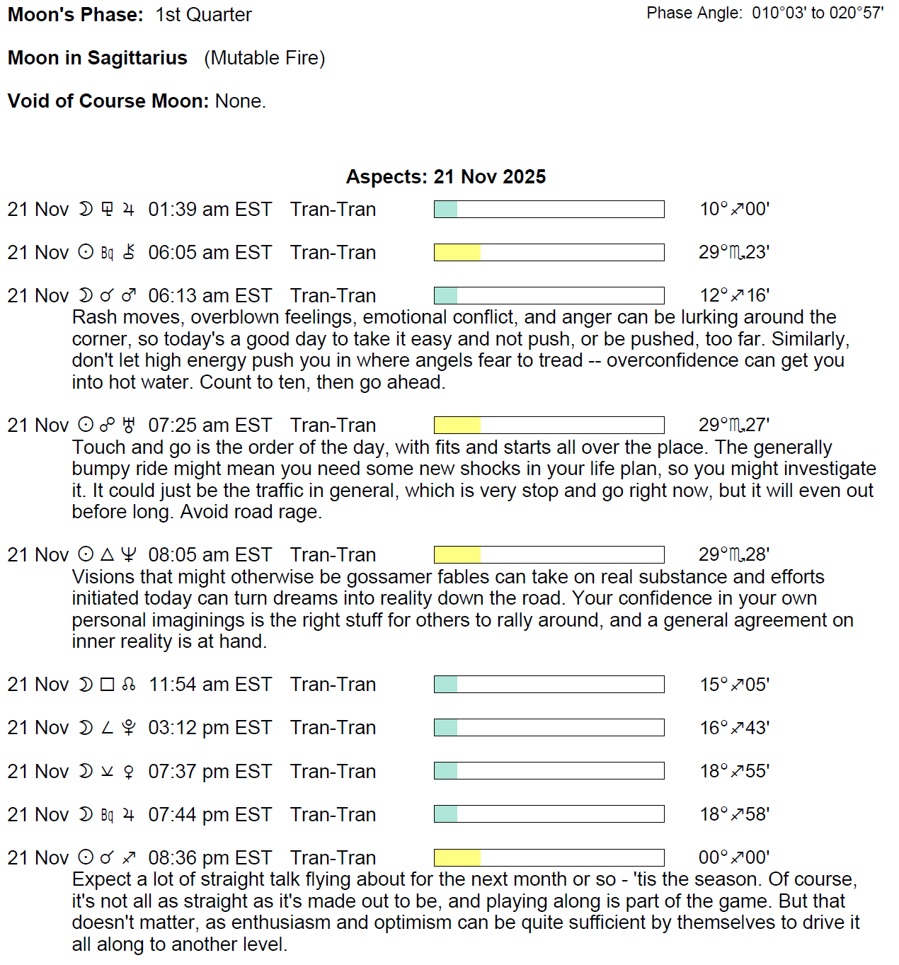 Planet Color Key: The longer the bar, the slower the aspecting planet, and the longer the duration of the planet’s transit.