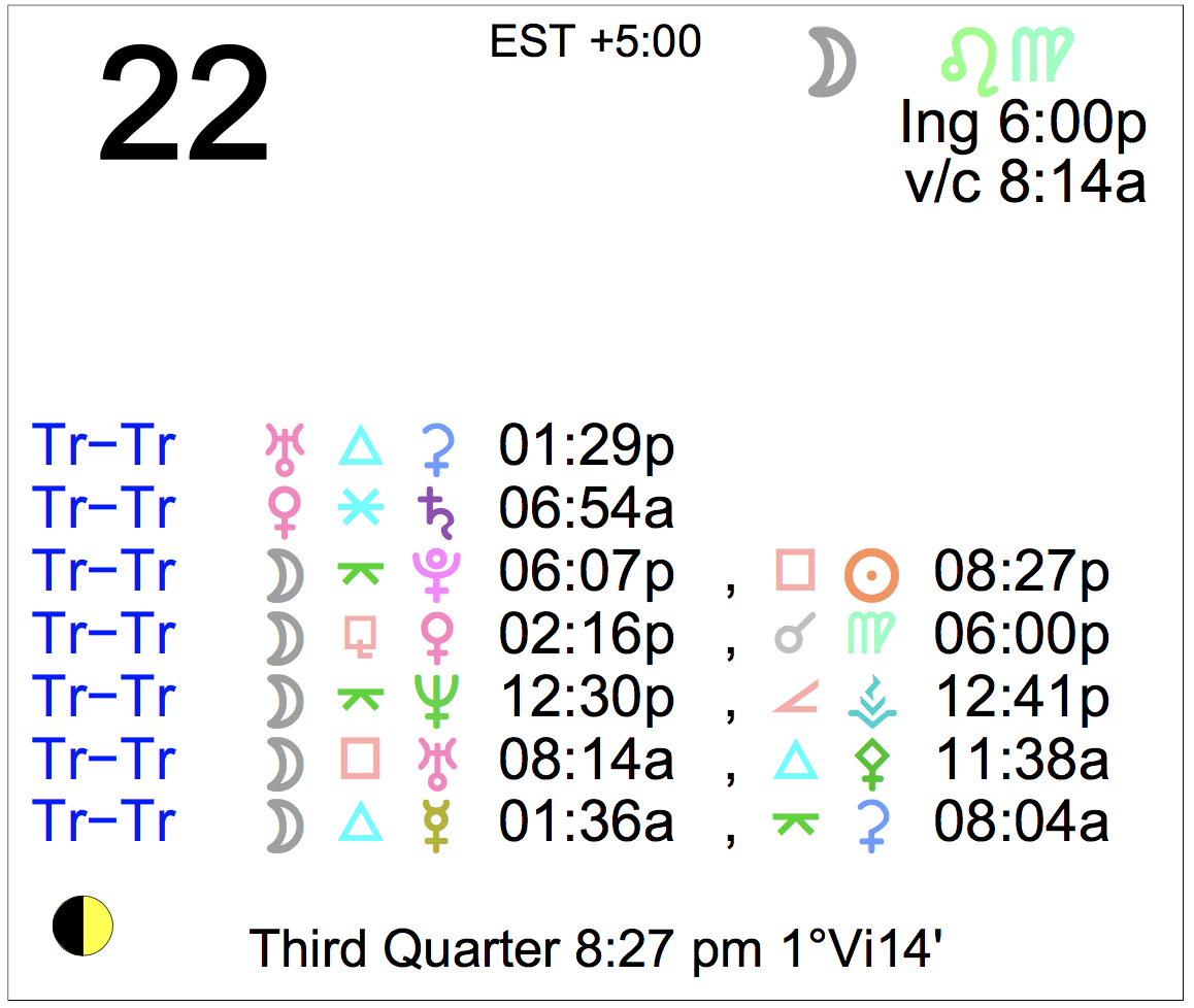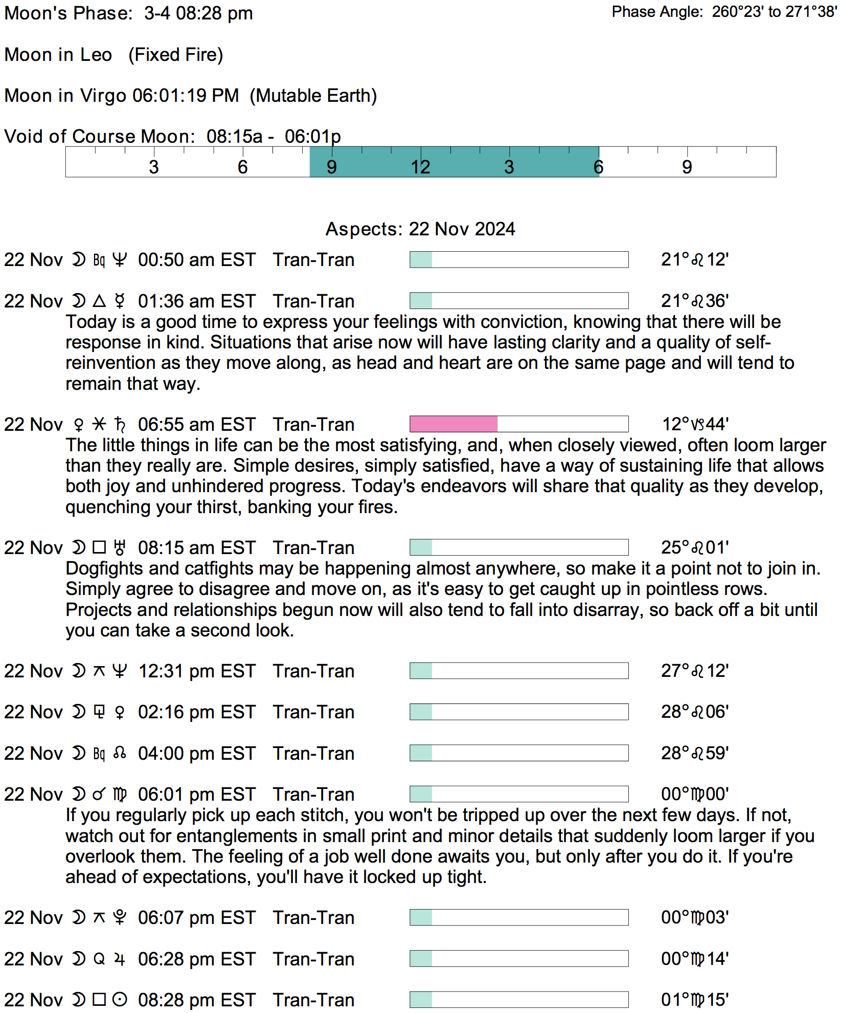 Planet Color Key: The longer the bar, the slower the aspecting planet, and the longer the duration of the planet’s transit.
