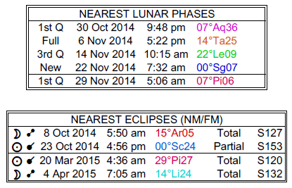 Note that the Moon moves at a rate of approximately one degree every 2 hours, so that if an aspect involving is applying and has an orb of 5 degrees, the aspect will perfect (be exact) in about 10 hours. If the Moon is separating from an aspect with an orb of 2 degrees, it has already formed said aspect approximately 4 hours ago (since the following are positions at noon today, then it would have occurred at about 8 AM today).