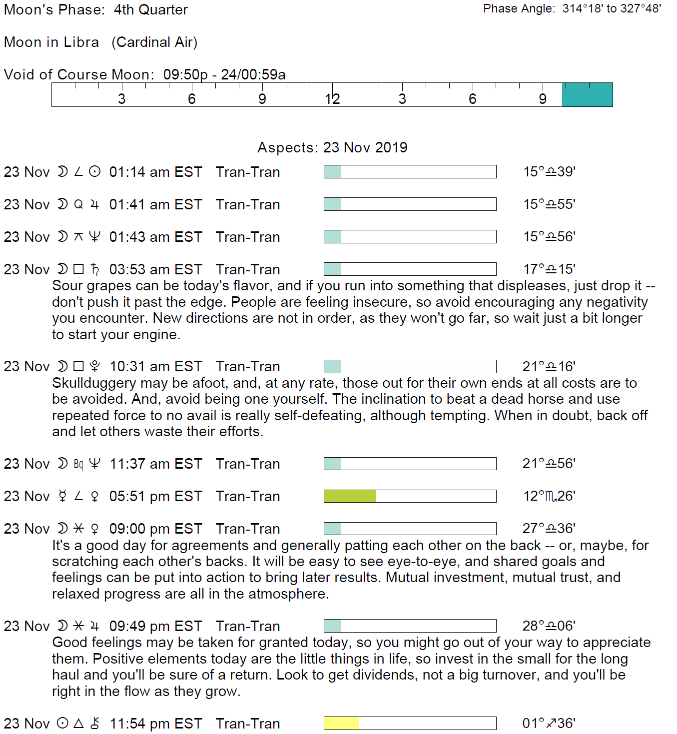 Planet Color Key: The longer the bar, the slower the aspecting planet and the longer the duration of the planet’s transit.