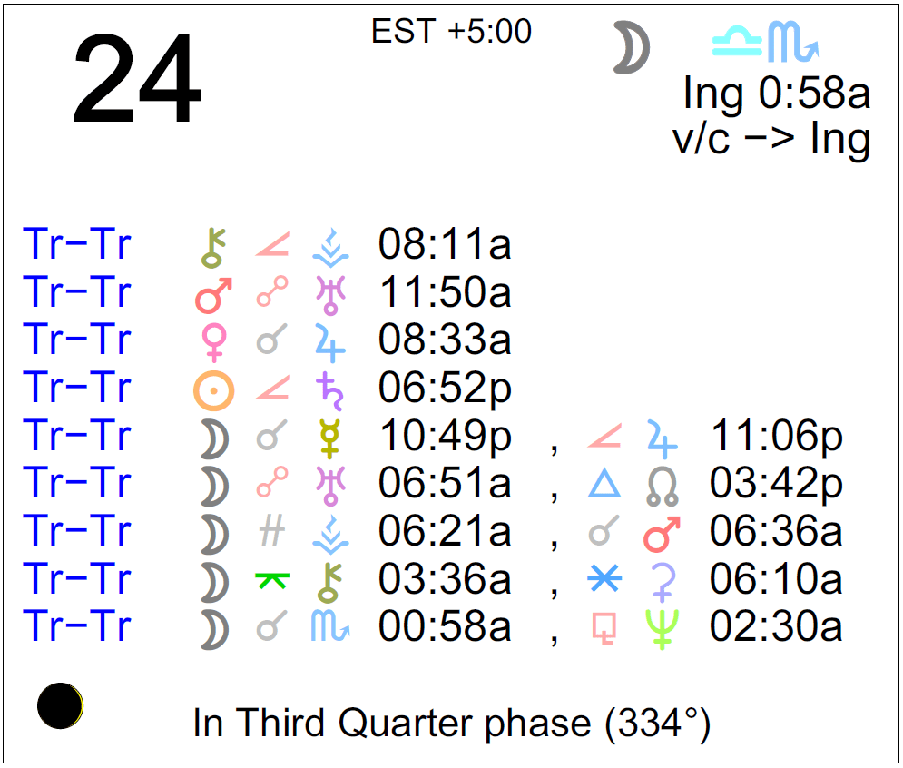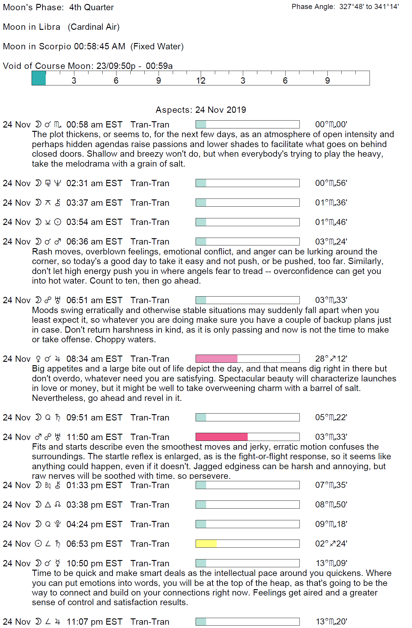 Planet Color Key: The longer the bar, the slower the aspecting planet and the longer the duration of the planet’s transit.