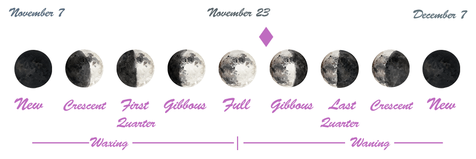 - The Full Moon occurred on November 23rd in the sign of Gemini. We’re in between the Full Moon, which happened on the 23rd, and the Last Quarter Moon, which will happen on the 29th.