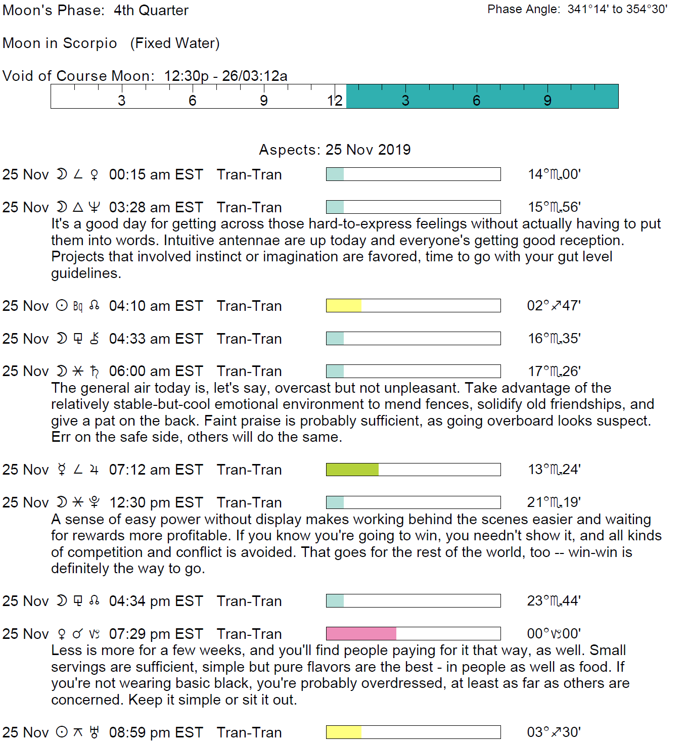 Planet Color Key: The longer the bar, the slower the aspecting planet and the longer the duration of the planet’s transit.