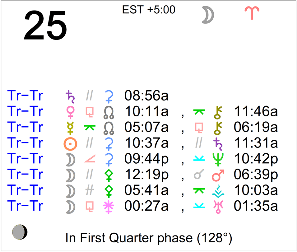 Planet Color Key: The longer the bar, the slower the aspecting planet, and the longer the duration of the planet’s transit.