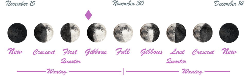 - We are in between the First Quarter Moon that occurred on the 21st and the Full Moon/Lunar Eclipse that will occur on November 30th.