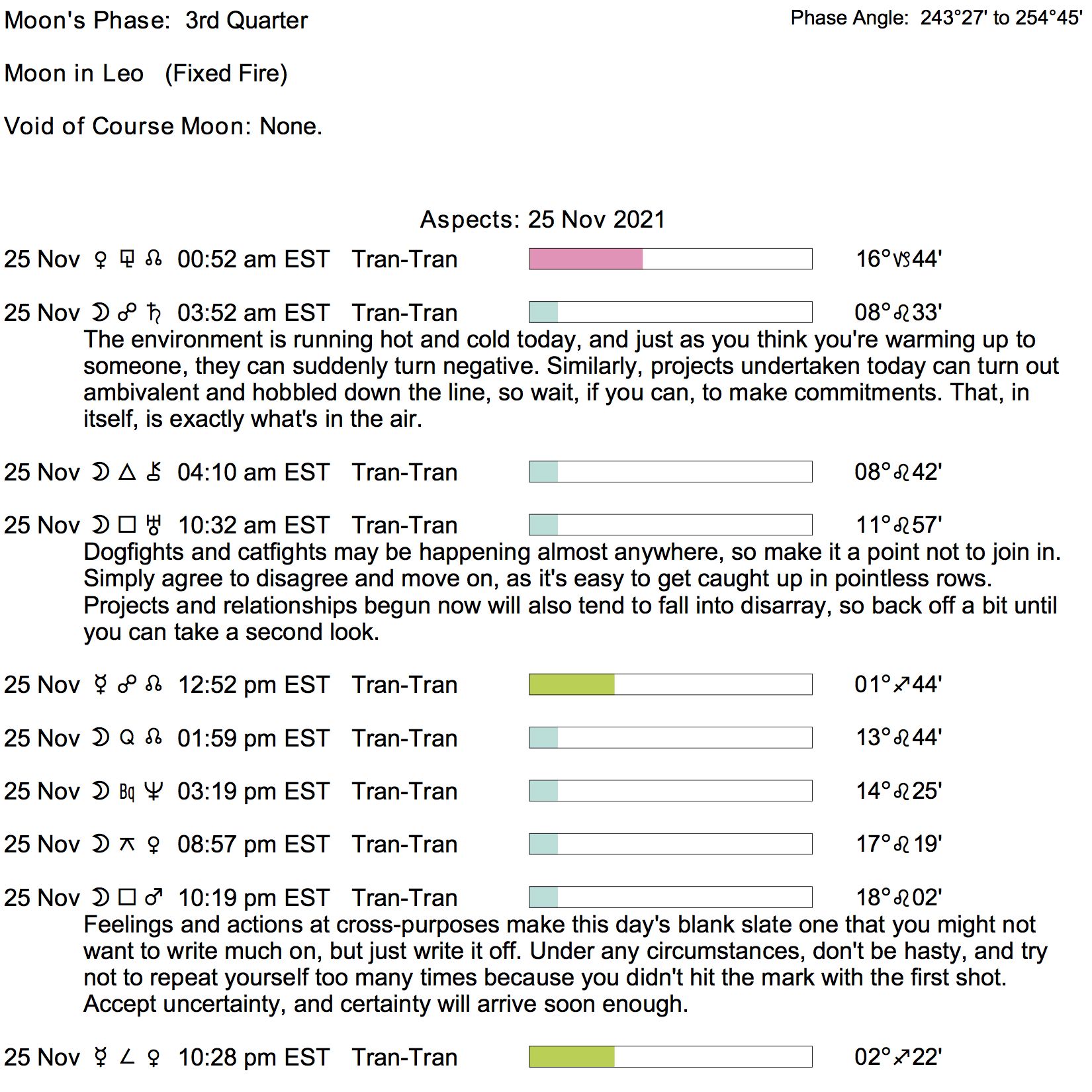 Planet Color Key: The longer the bar, the slower the aspecting planet, and the longer the duration of the planet’s transit.