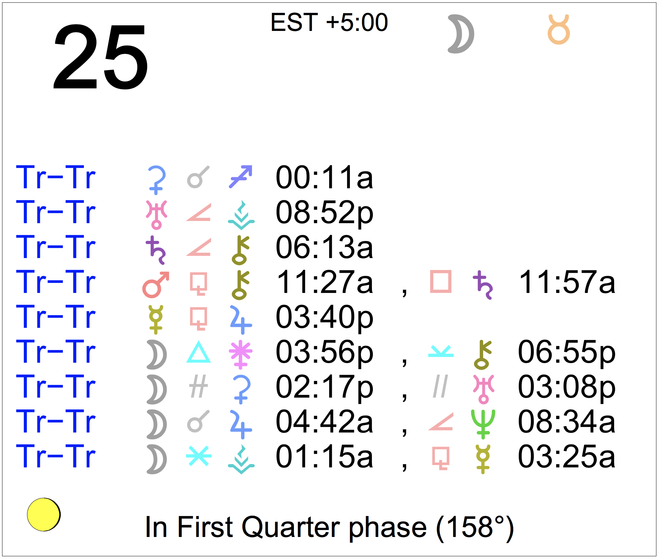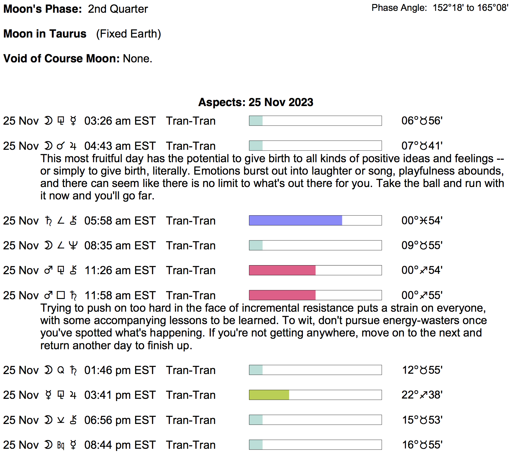 Planet Color Key: The longer the bar, the slower the aspecting planet, and the longer the duration of the planet’s transit.
