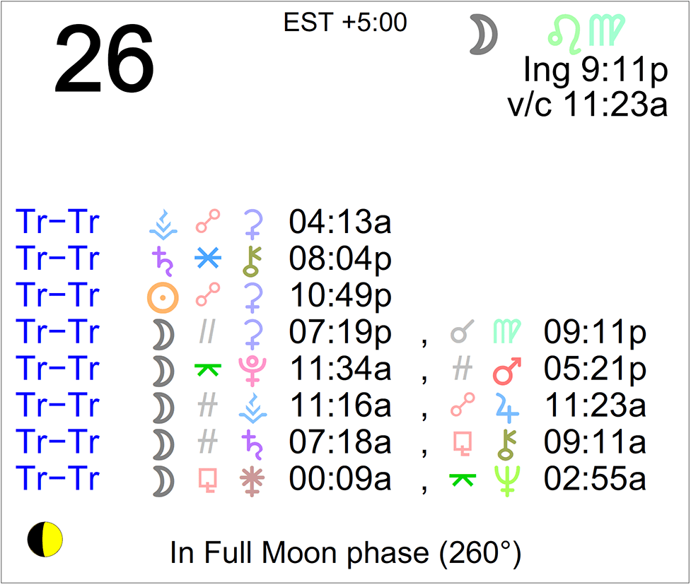 Planet Color Key: The longer the bar, the slower the aspecting planet, and the longer the duration of the planet’s transit.
