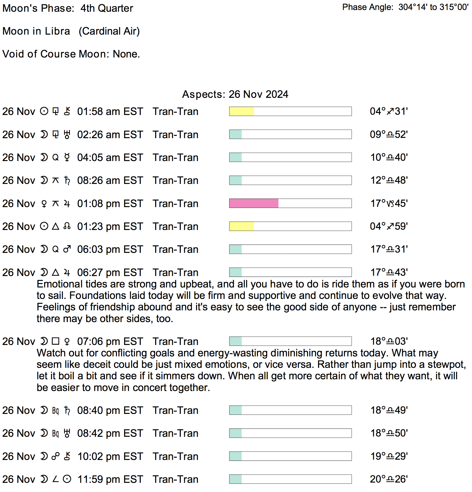 Planet Color Key: The longer the bar, the slower the aspecting planet, and the longer the duration of the planet’s transit.
