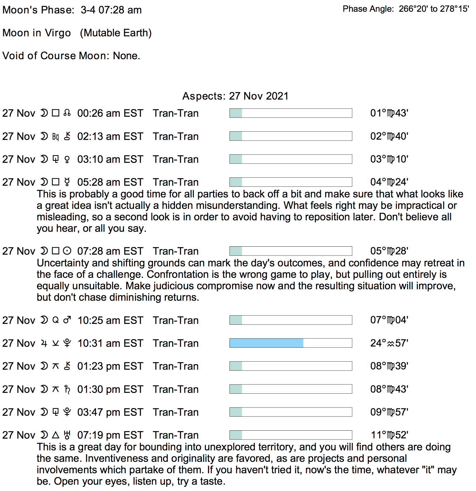Planet Color Key: The longer the bar, the slower the aspecting planet, and the longer the duration of the planet’s transit.