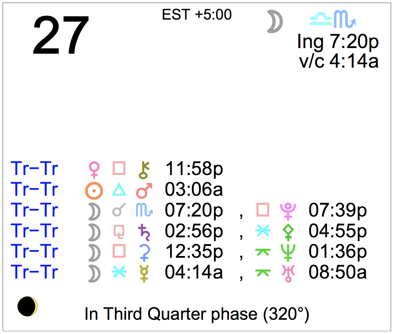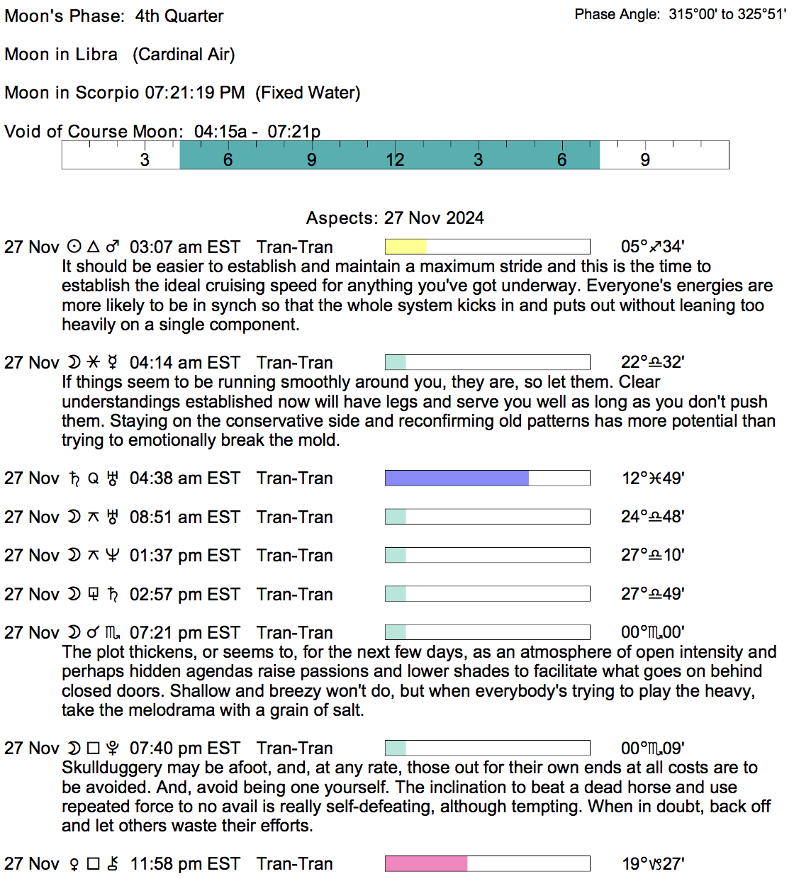 Planet Color Key: The longer the bar, the slower the aspecting planet, and the longer the duration of the planet’s transit.