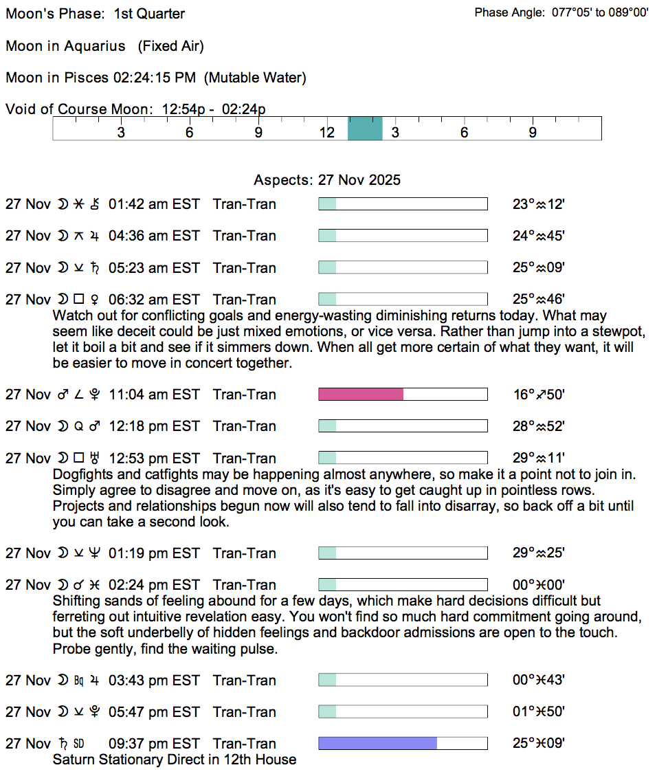 Planet Color Key: The longer the bar, the slower the aspecting planet, and the longer the duration of the planet’s transit.