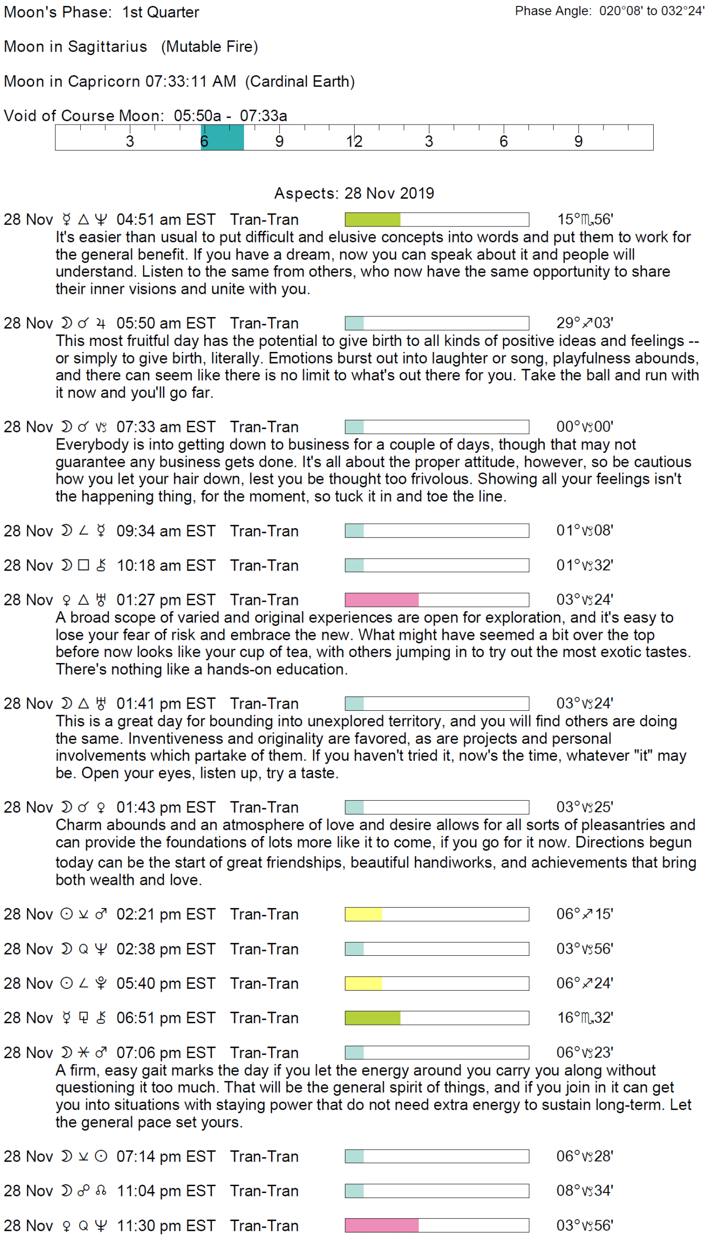 Planet Color Key: The longer the bar, the slower the aspecting planet and the longer the duration of the planet’s transit.