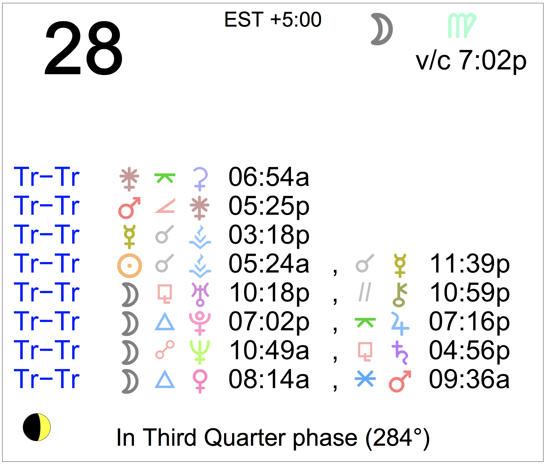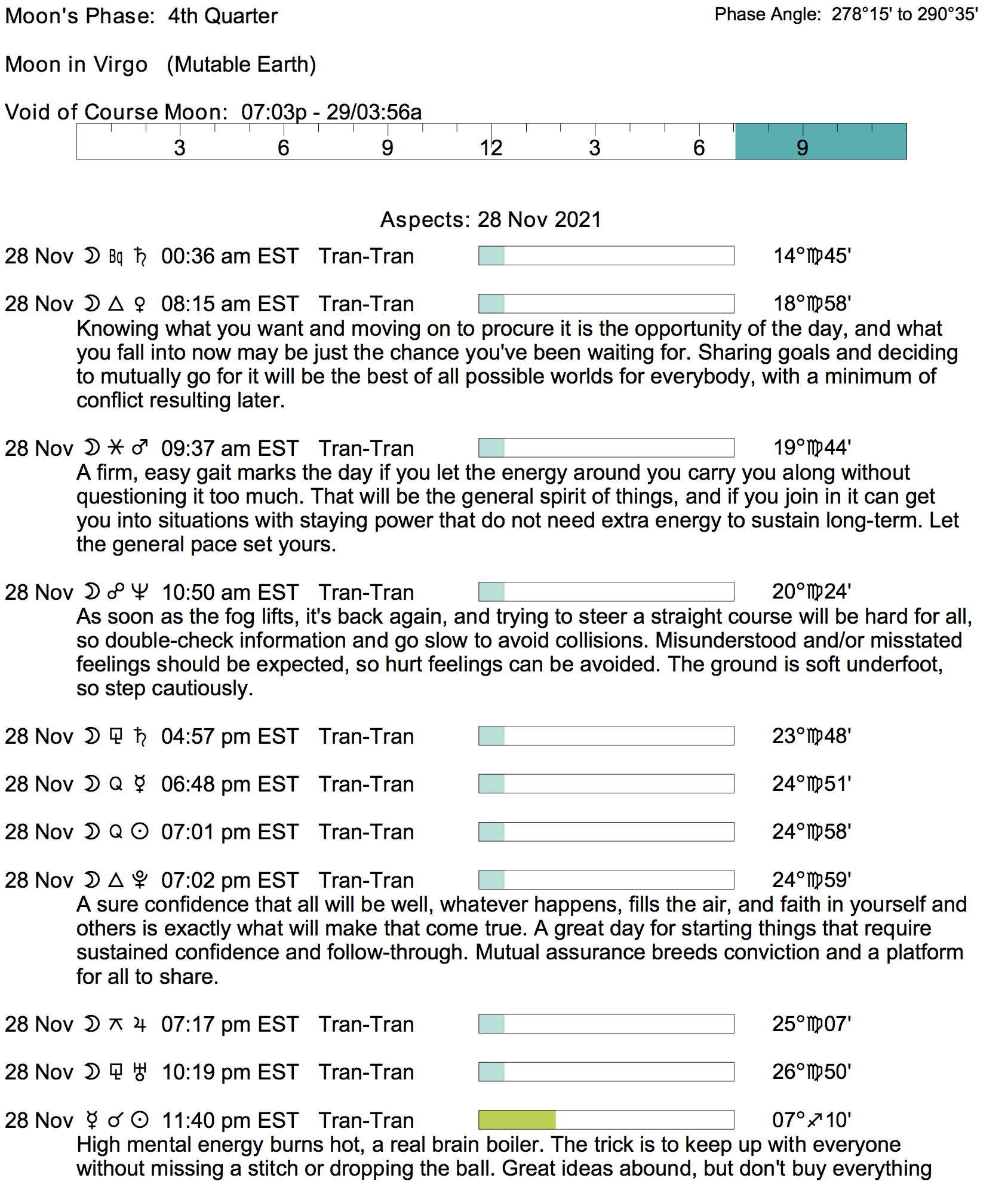 Planet Color Key: The longer the bar, the slower the aspecting planet, and the longer the duration of the planet’s transit.