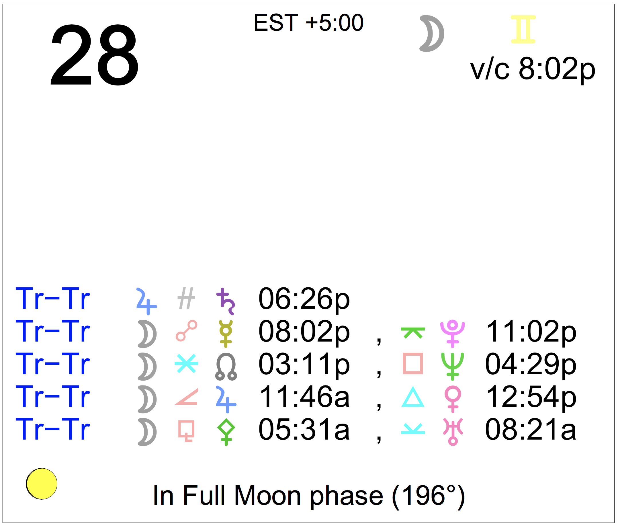 - The Full Moon occurs this morning at 4:16 AM in the sign of Gemini.