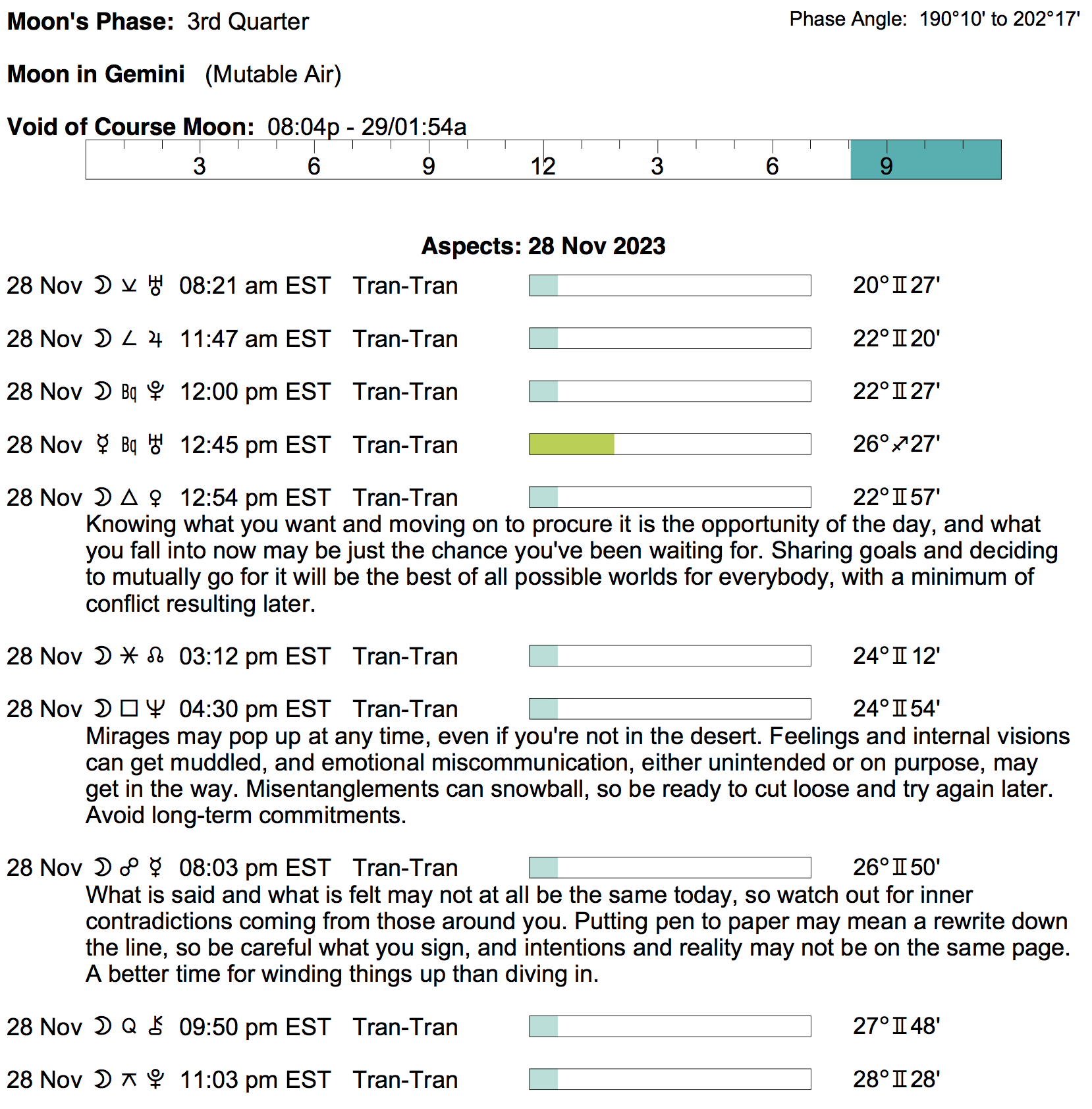 Planet Color Key: The longer the bar, the slower the aspecting planet, and the longer the duration of the planet’s transit.
