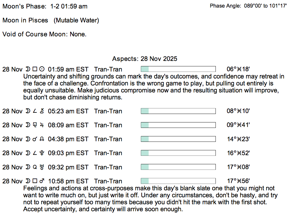 Planet Color Key: The longer the bar, the slower the aspecting planet, and the longer the duration of the planet’s transit.