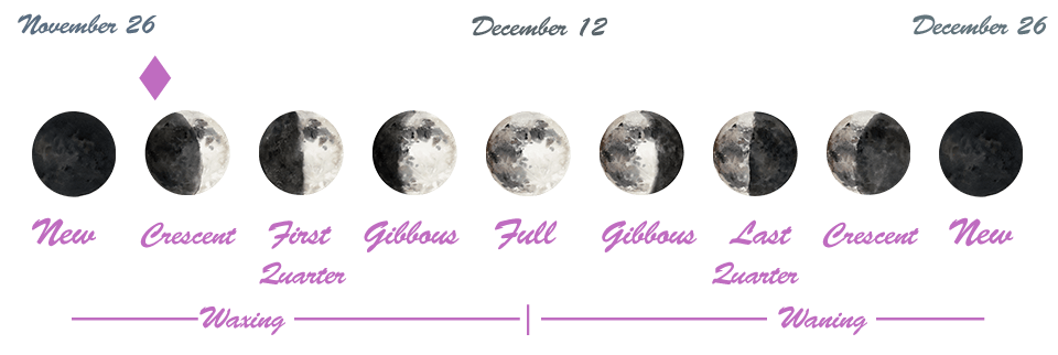 - We are in between the New Moon, which occurred on the 26th, and the First Quarter Moon, which will happen on December 4th.