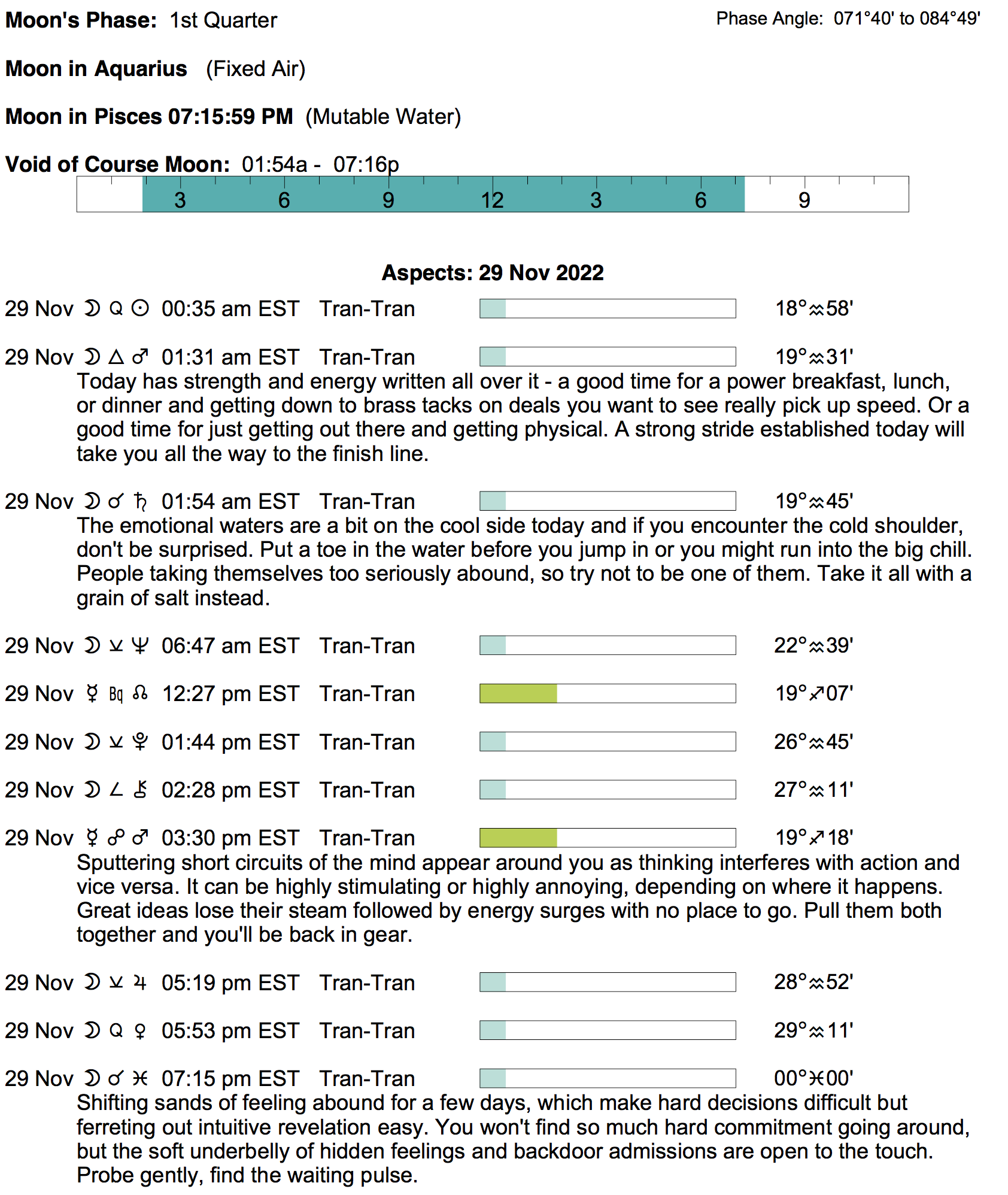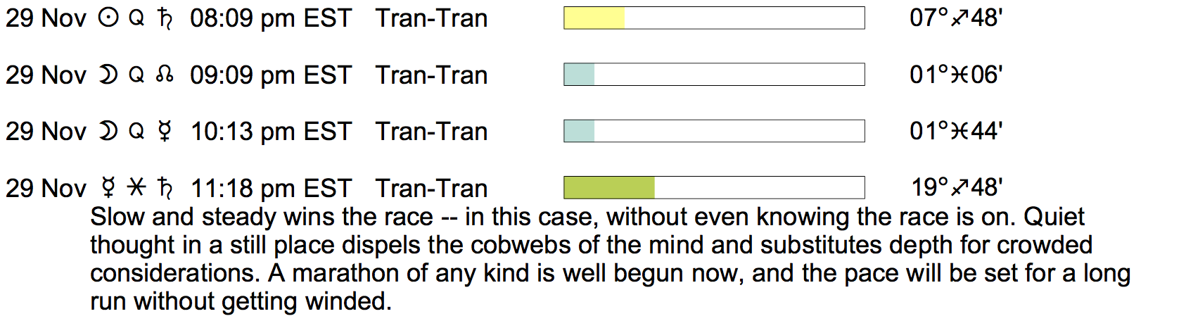Planet Color Key: The longer the bar, the slower the aspecting planet, and the longer the duration of the planet’s transit.