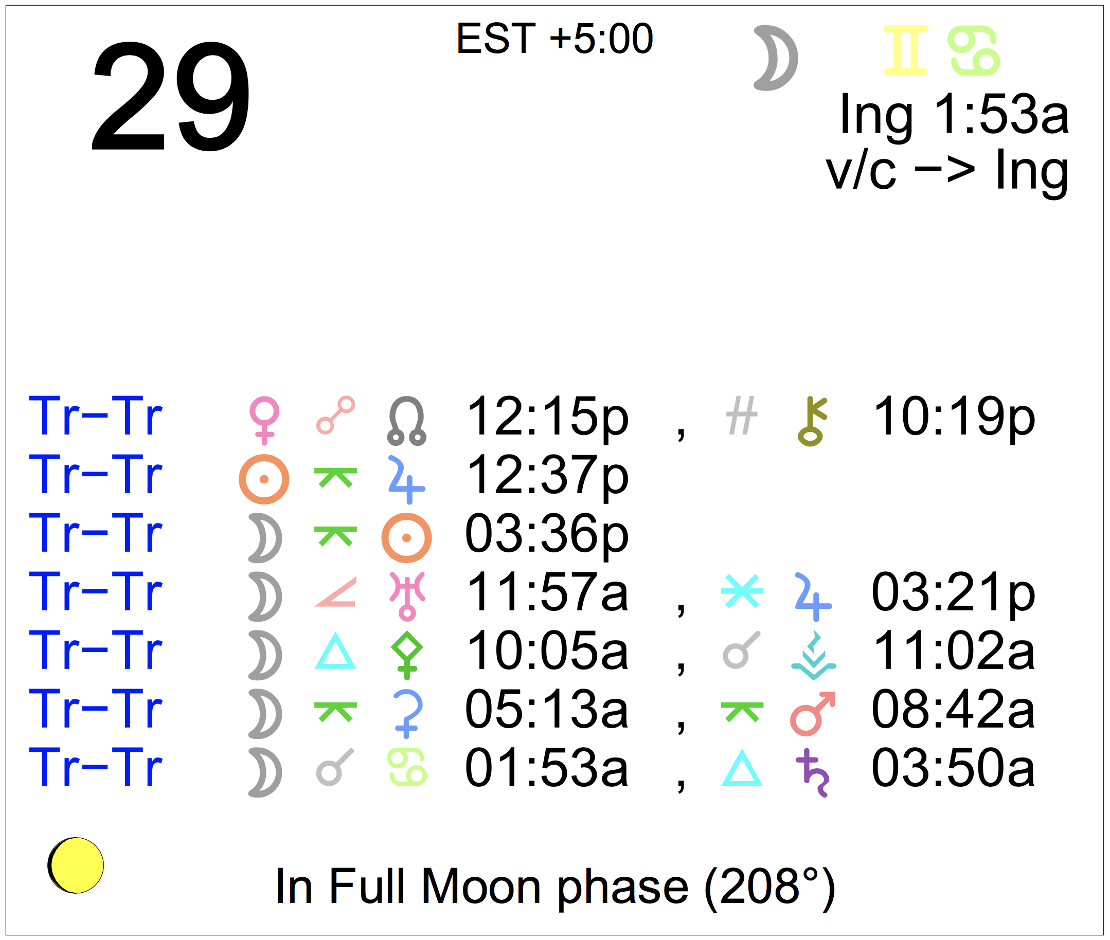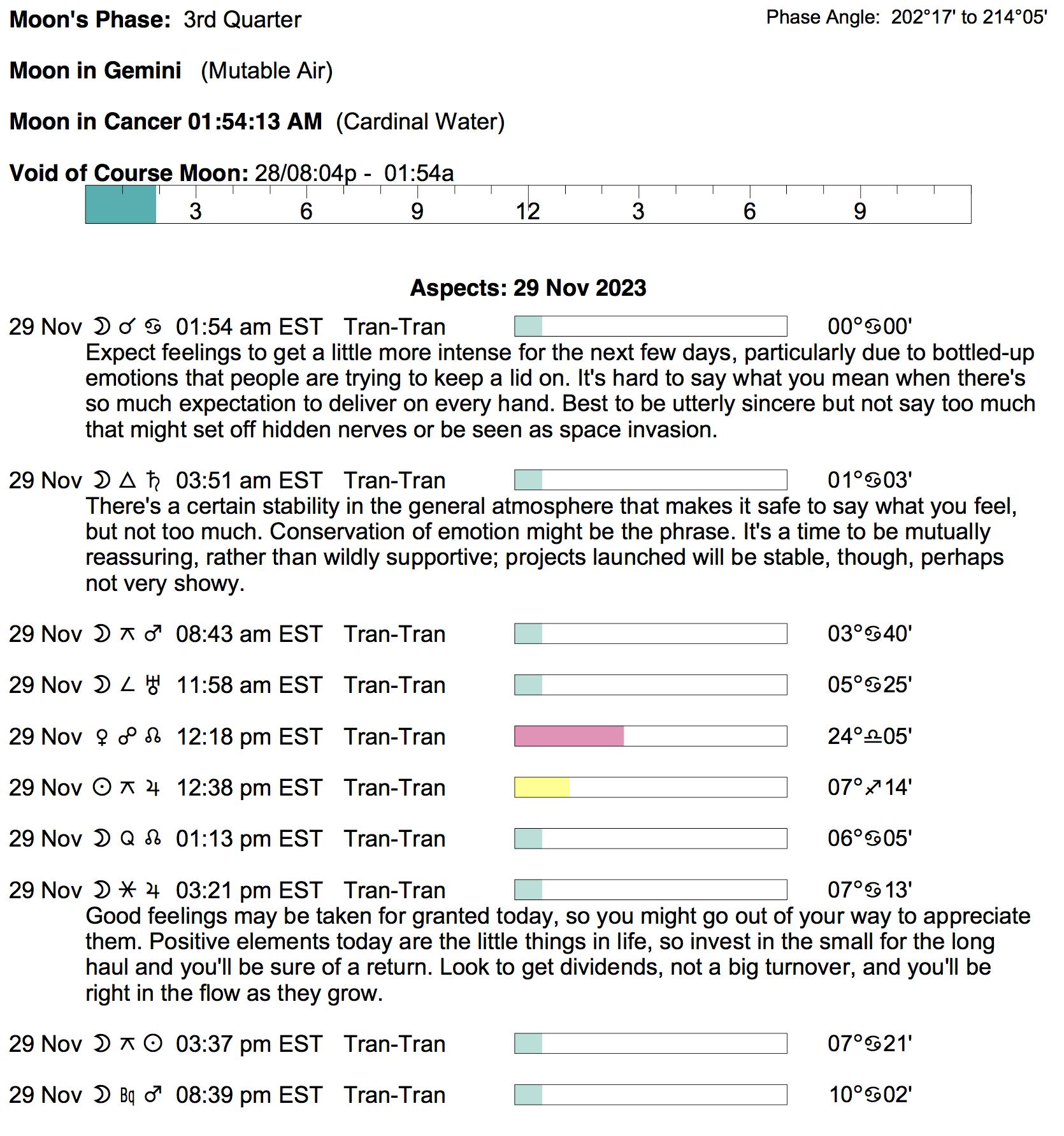Planet Color Key: The longer the bar, the slower the aspecting planet, and the longer the duration of the planet’s transit.