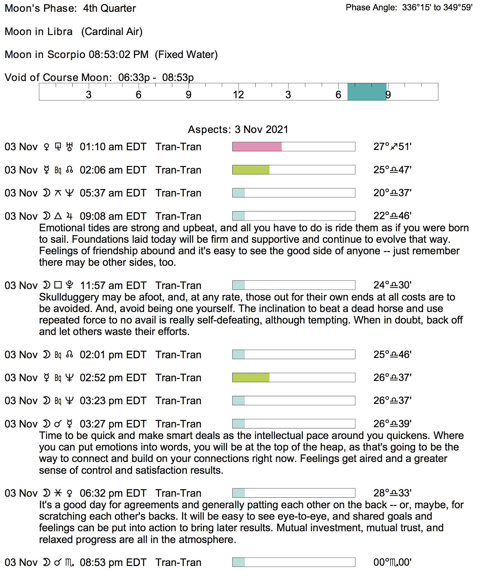 Planet Color Key: The longer the bar, the slower the aspecting planet, and the longer the duration of the planet’s transit.