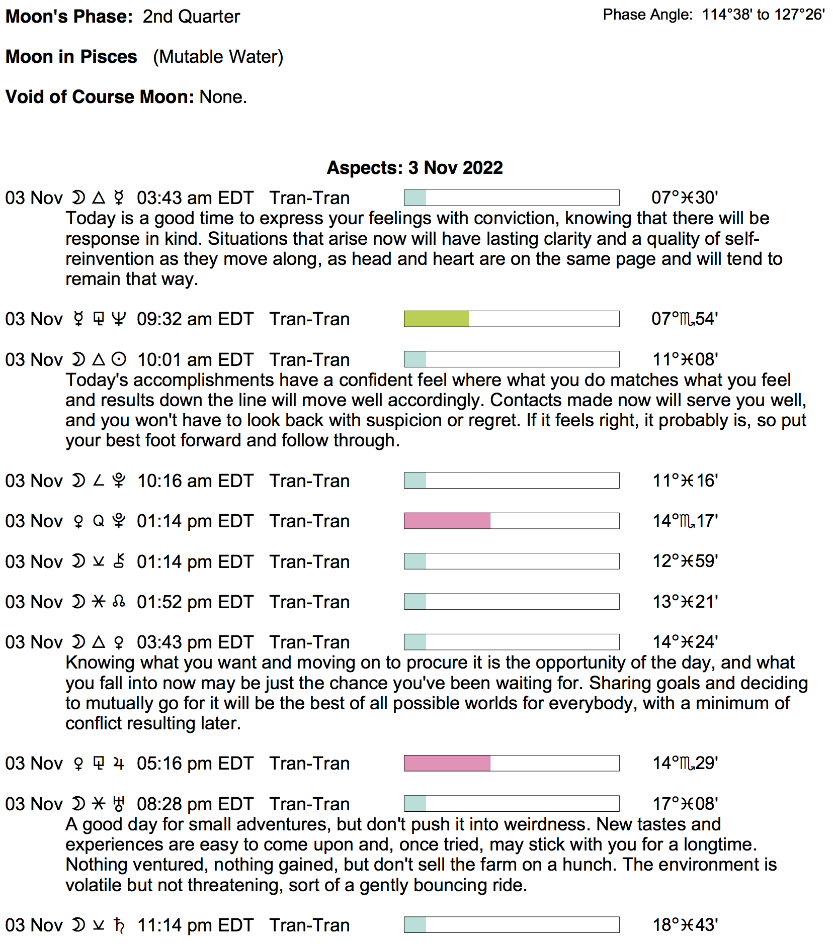 Planet Color Key: The longer the bar, the slower the aspecting planet, and the longer the duration of the planet’s transit.