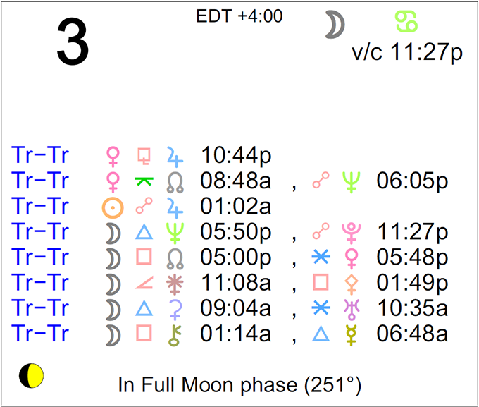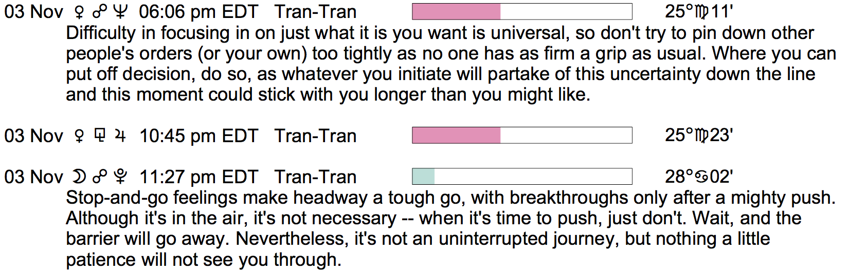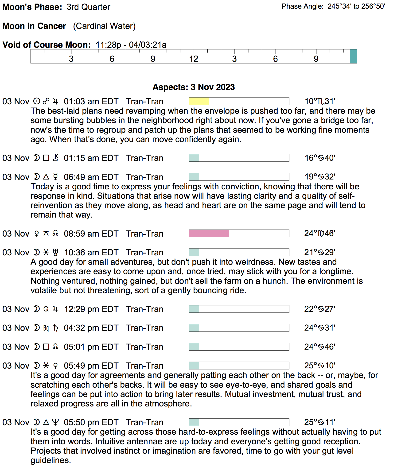 Planet Color Key: The longer the bar, the slower the aspecting planet, and the longer the duration of the planet’s transit.