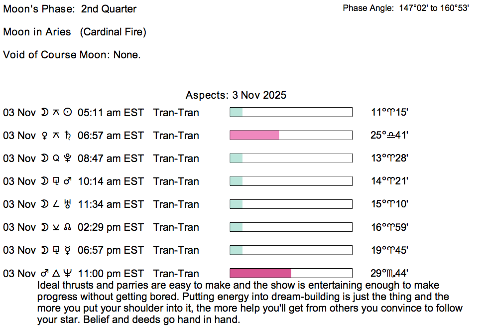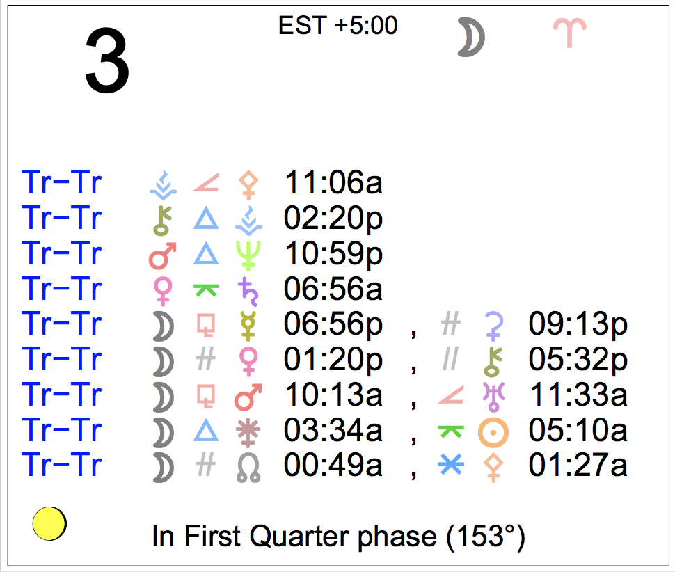 Planet Color Key: The longer the bar, the slower the aspecting planet, and the longer the duration of the planet’s transit.