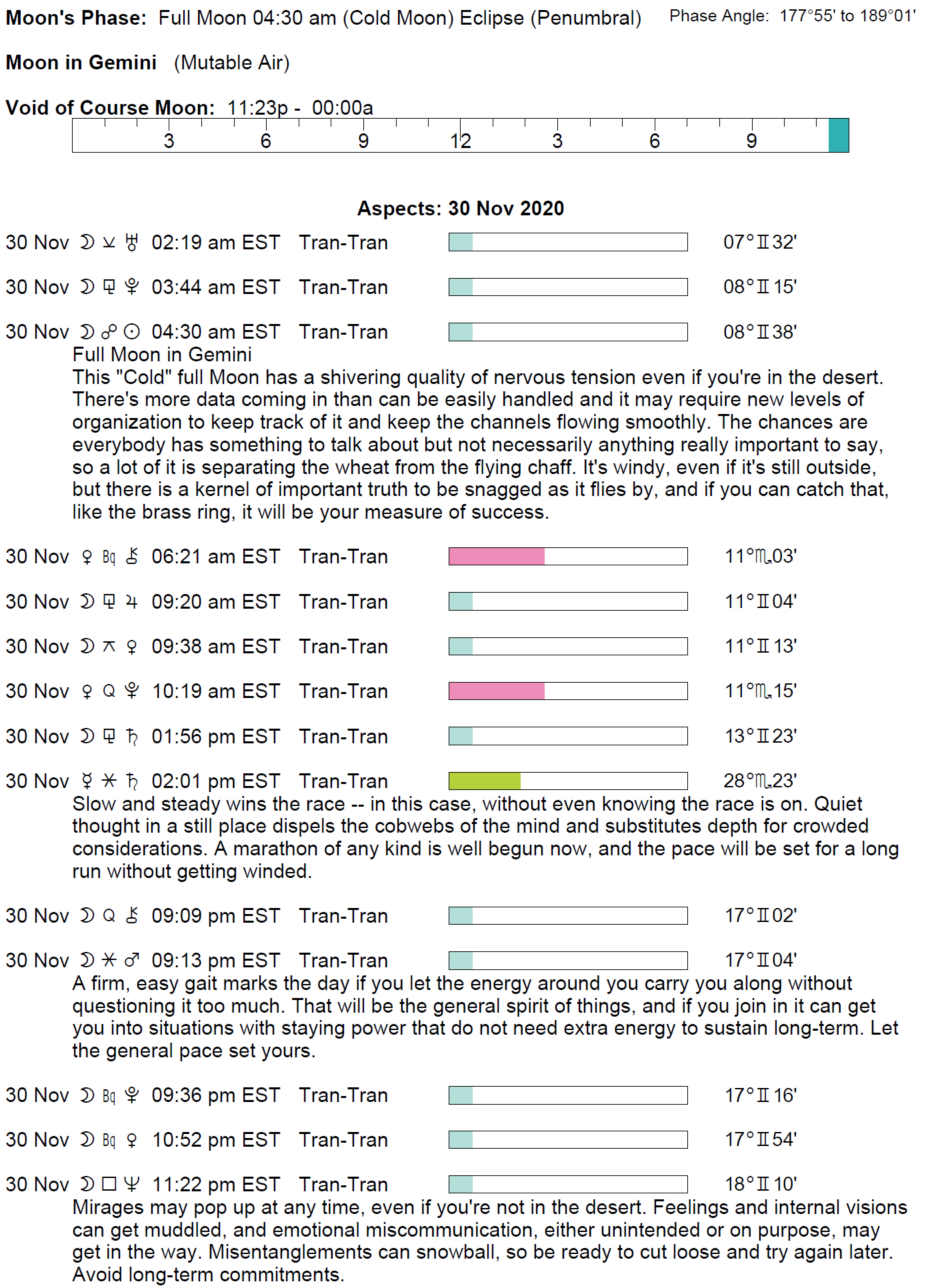Planet Color Key: The longer the bar, the slower the aspecting planet, and the longer the duration of the planet’s transit.