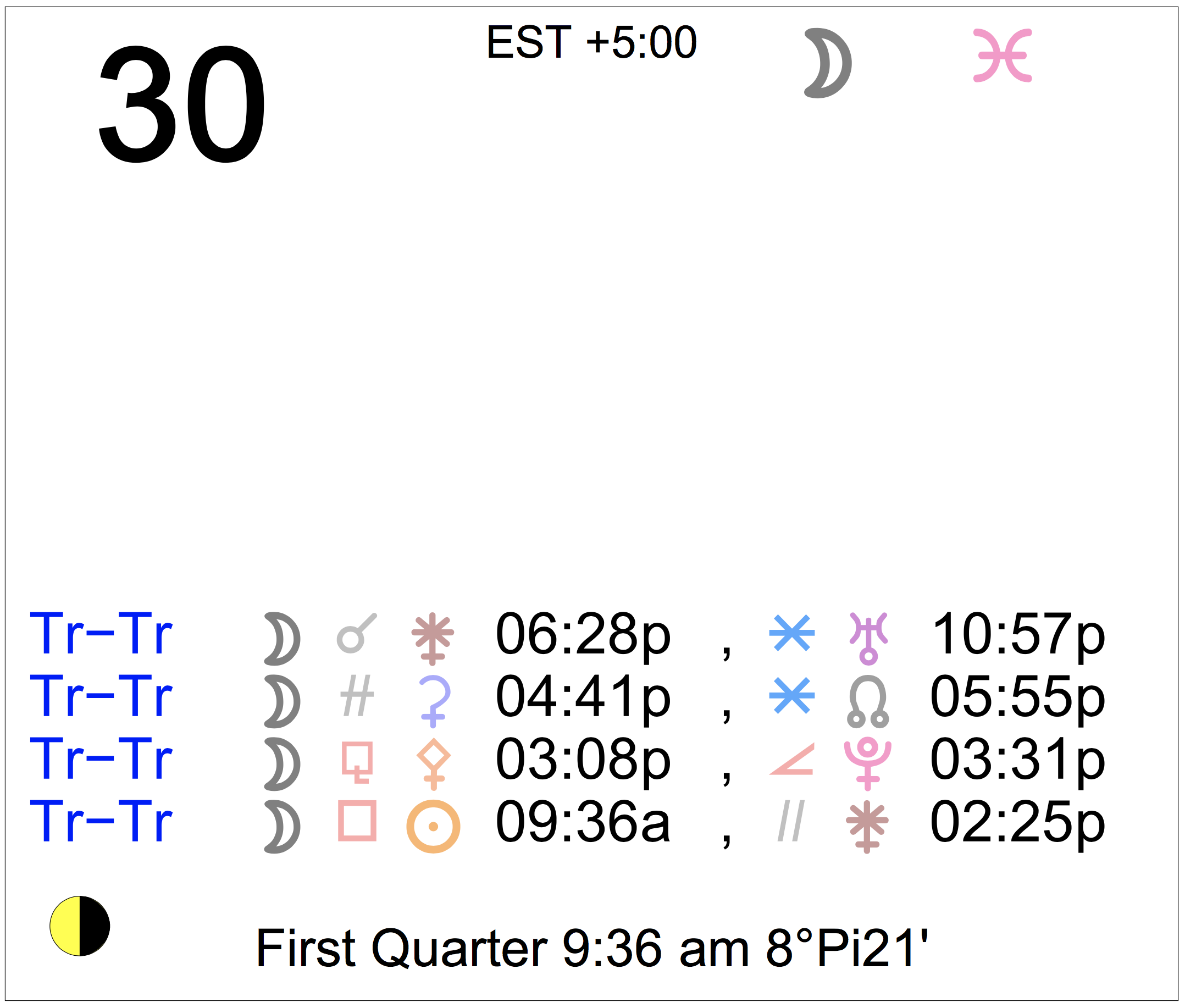 Planet Color Key: The longer the bar, the slower the aspecting planet, and the longer the duration of the planet’s transit.