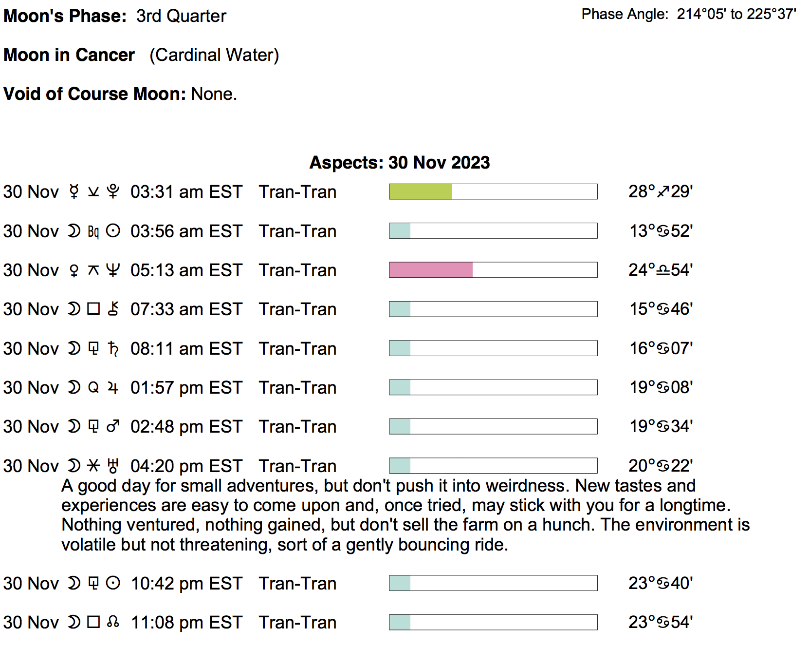Planet Color Key: The longer the bar, the slower the aspecting planet, and the longer the duration of the planet’s transit.