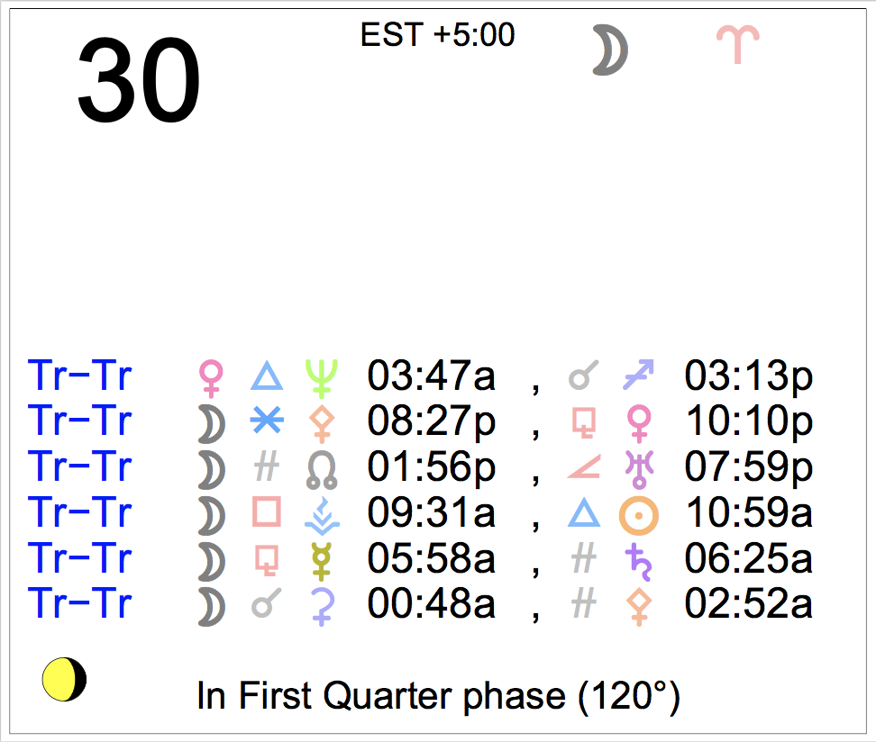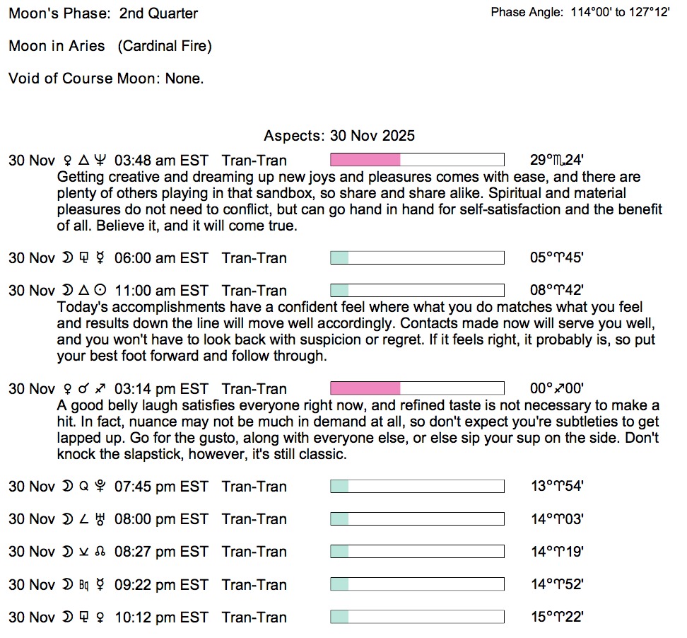 Planet Color Key: The longer the bar, the slower the aspecting planet, and the longer the duration of the planet’s transit.