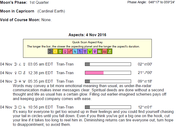 The following aspects (major only) and positions are at noon (EDT) on November 4th: