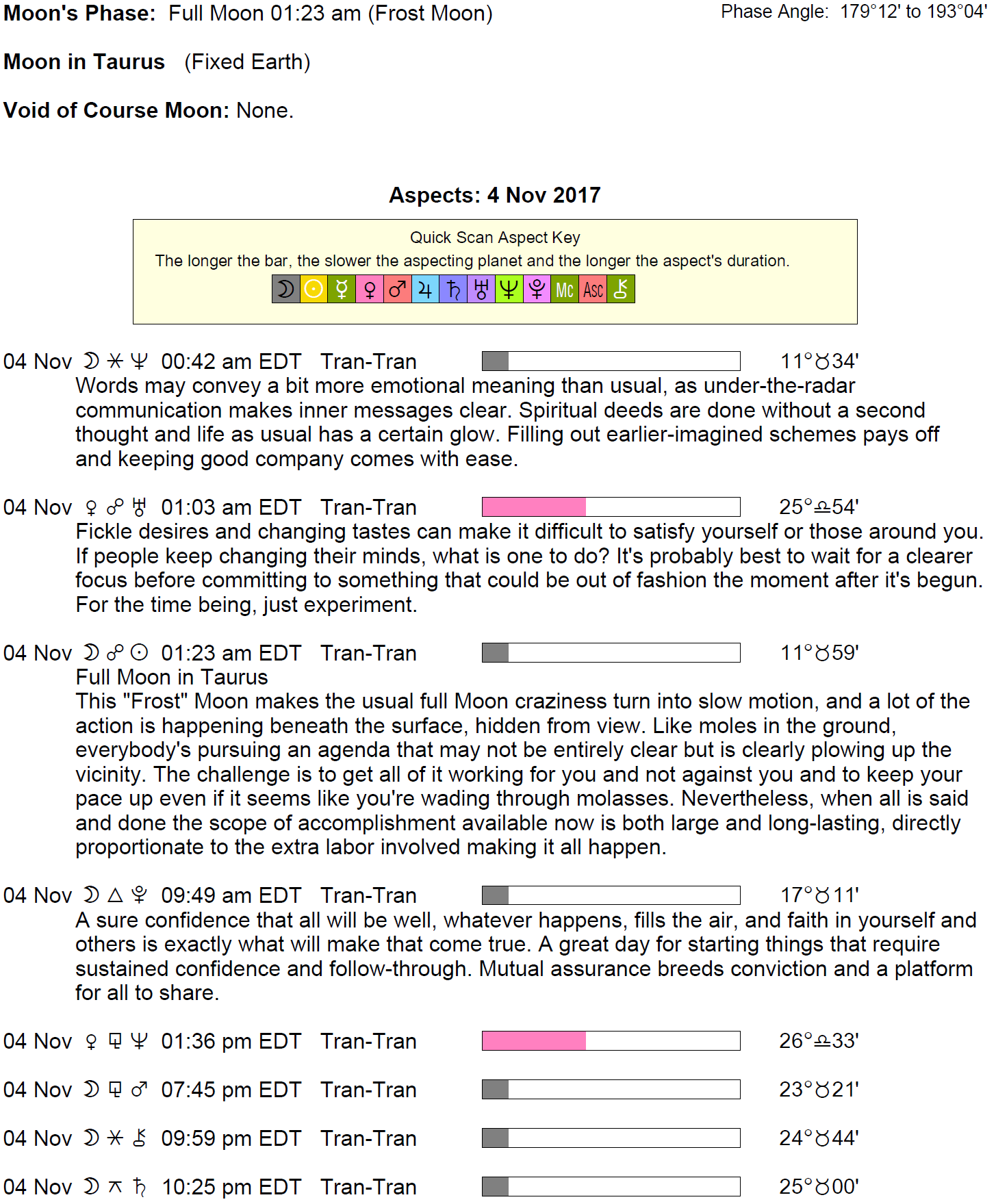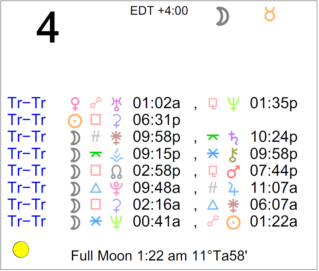 - The Full Moon occurs today in the sign of Taurus at 1:22 AM.
