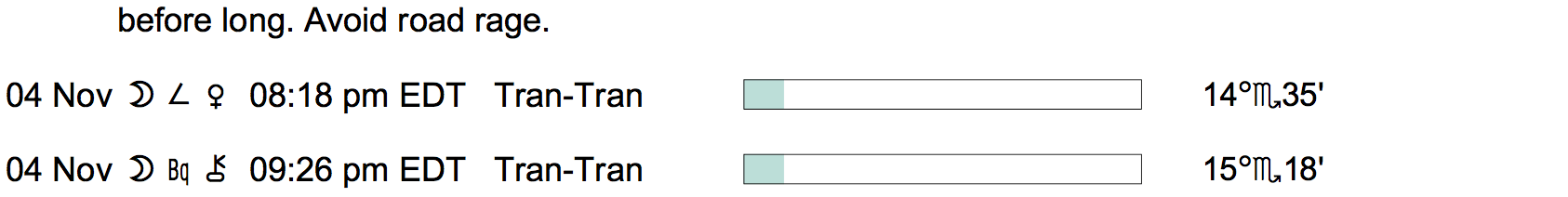Planet Color Key: The longer the bar, the slower the aspecting planet, and the longer the duration of the planet’s transit.