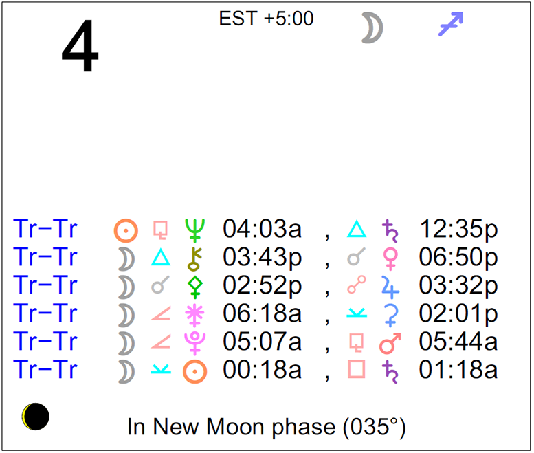 Planet Color Key: The longer the bar, the slower the aspecting planet, and the longer the duration of the planet’s transit.