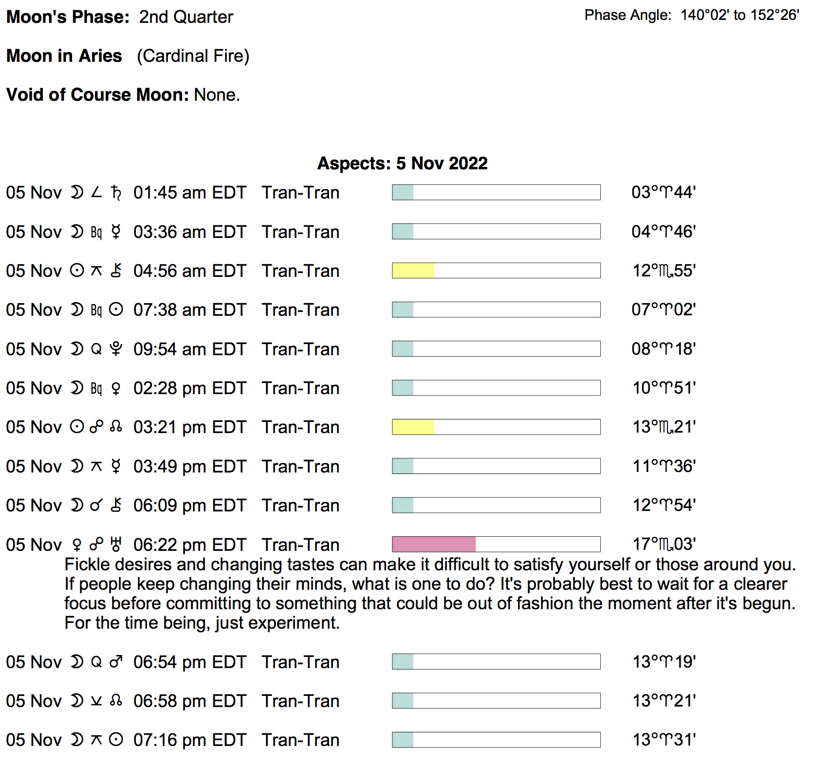 Planet Color Key: The longer the bar, the slower the aspecting planet, and the longer the duration of the planet’s transit.