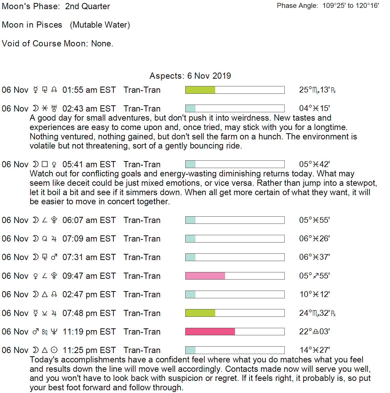 Planet Color Key: The longer the bar, the slower the aspecting planet and the longer the duration of the planet’s transit.