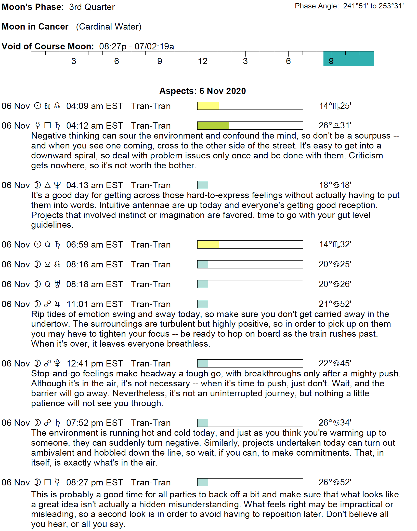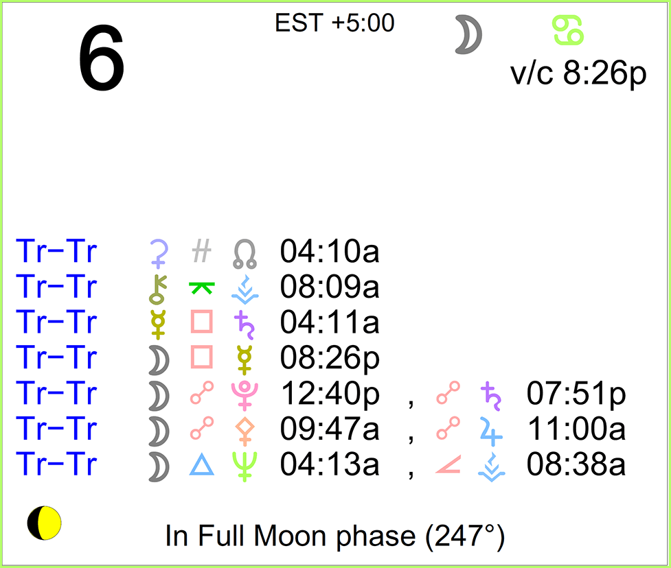 Planet Color Key: The longer the bar, the slower the aspecting planet, and the longer the duration of the planet’s transit.