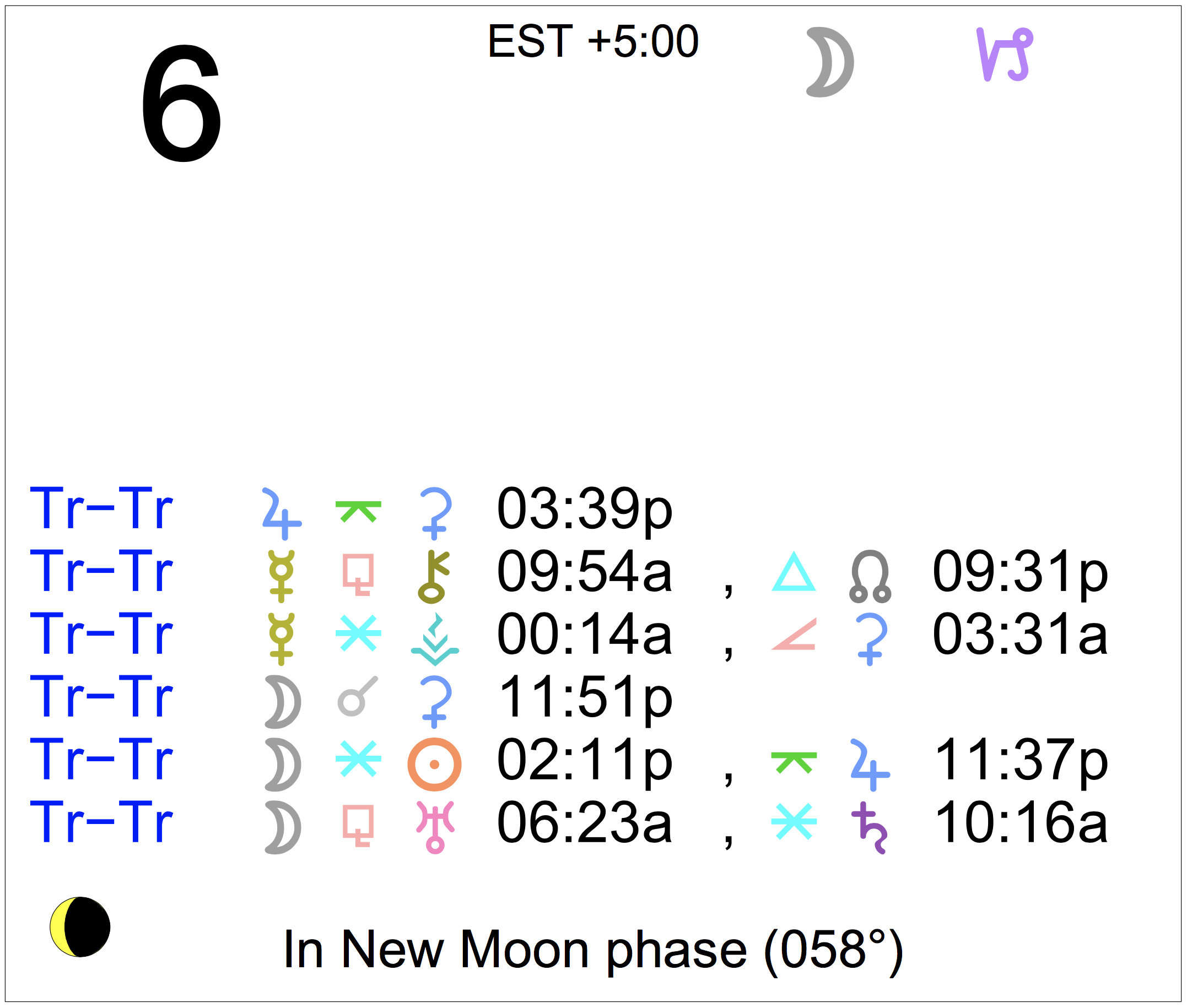 Planet Color Key: The longer the bar, the slower the aspecting planet, and the longer the duration of the planet’s transit.