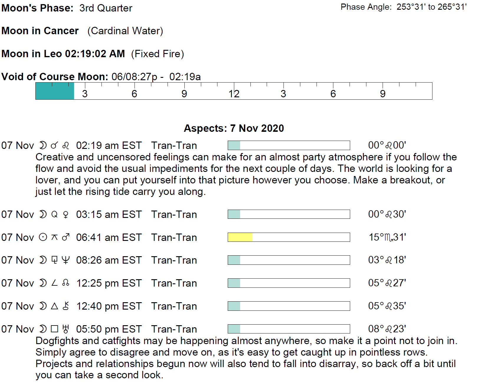 Planet Color Key: The longer the bar, the slower the aspecting planet, and the longer the duration of the planet’s transit.