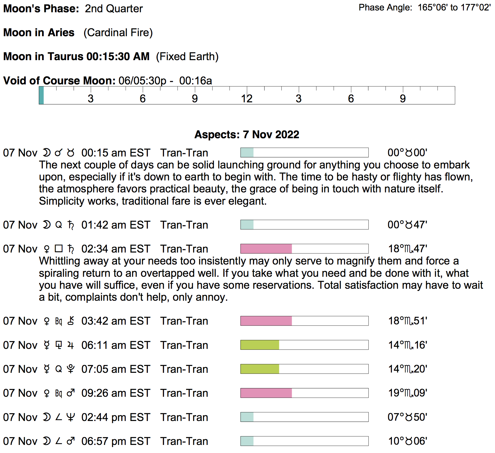 Planet Color Key: The longer the bar, the slower the aspecting planet, and the longer the duration of the planet’s transit.