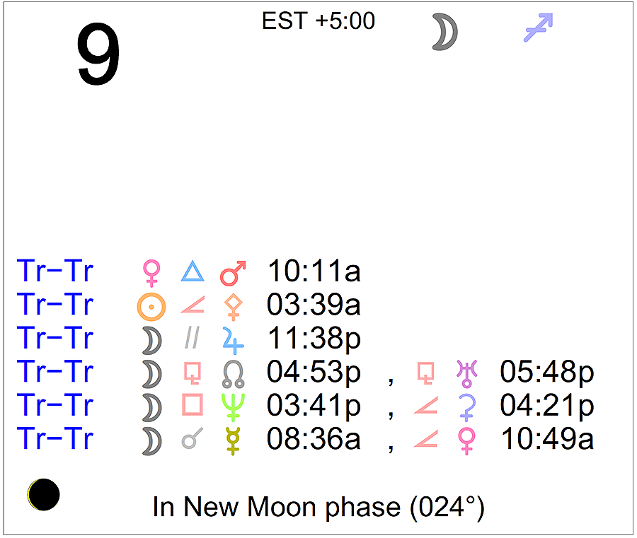 The following aspects (major only) and positions are at noon (EST) on November 9th: